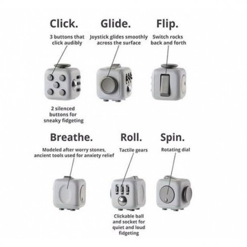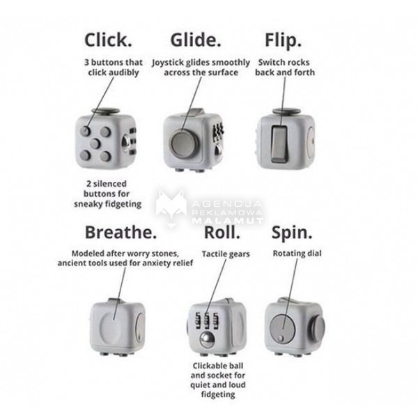 FIDGET CUBE to idealny gadżet dla każdego. Odstersowuje, pozwala zająć czymś ręce, zastepuje długopisy, ołówki czy spinacze biurowe. Kostka posiada wiele rożnych przycisków i gałek, które możemy: przekręcać, obracać, klikać, pocierać, rolować.Produkt dostępny w kolorze: czarnym, żółtym, różowym, zielonym, niebieskim, szarym.