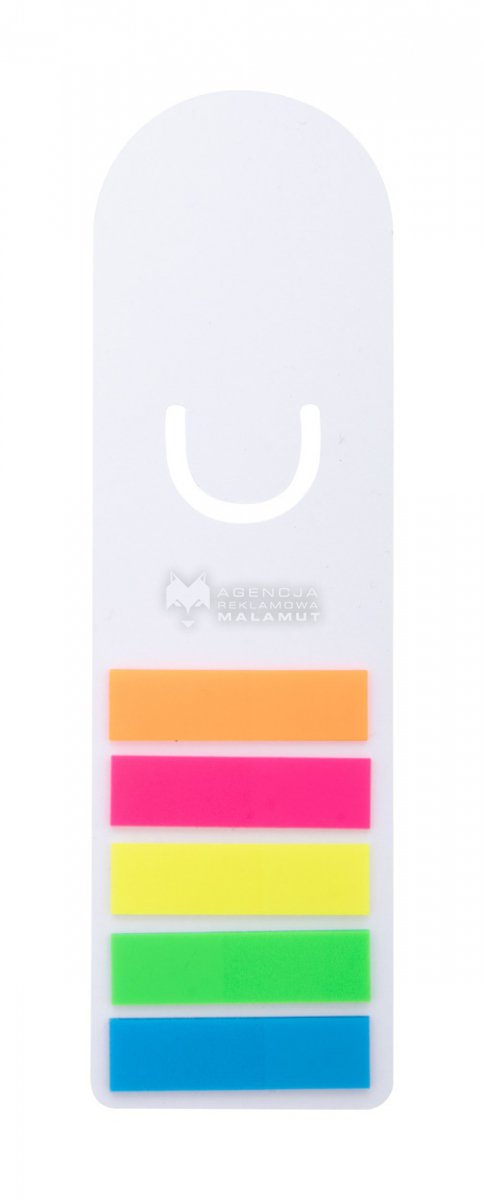 Personalizowana zakładka do książek z papieru ze znacznikami. Zawiera 100 znaczników z folii w 5 różnych kolorach (44x12 mm). Cena obejmuje nadruk full kolor na przedniej stronie. Min.ilość: 100 szt.