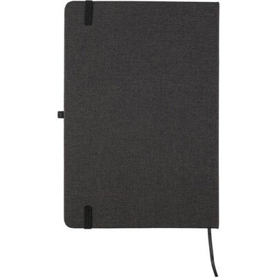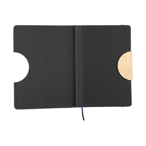 Notatnik ok. A5, posiada 80 stron w linie, tasiemka zakładkowa umożliwia wygodne zaznaczanie ostatniej strony lub ważniejszych notatek, dodatkowe zamknięcie w postaci dopasowanej kolorystycznie elastycznej opaski, składana okładka z bambusowym elementem zmienia się w stojak na telefon, zmieści się do szkolnego plecaka, produkt wykonany z RPET