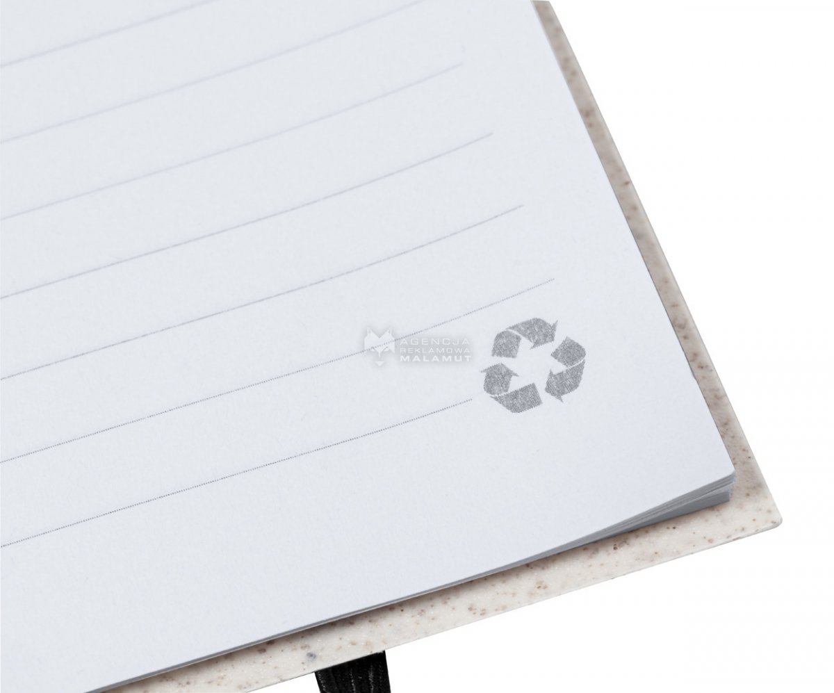 Notes z okładką z ekologicznego plastiku ze słomy pszenicznej z gumką, 70 kartek w linie z papieru z recyklingu. Zawiera plastikowy długopis ze słomy pszenicznej z niebieskim wkładem.