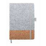 Notes pokryty filcem RPET i naturalnym korkiem, zawierający 80 kartek w linie, wykonany z papieru makulaturowego. Z zakładką, gumką i uchwytem na długopis. Rozmiar A5.