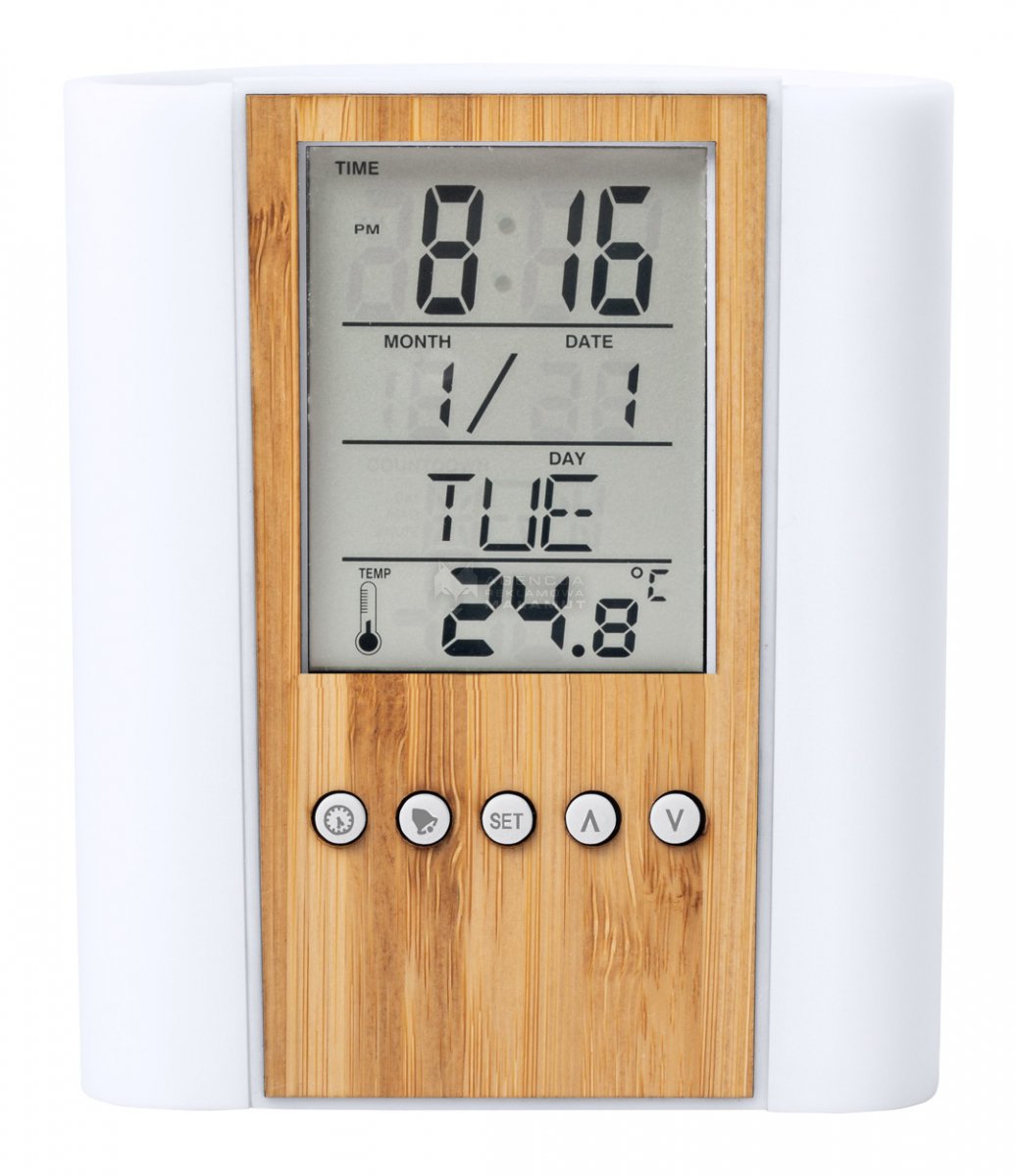 Wielofunkcyjny stojak biurkowy z plastiku z miejscem na długopisy, wyświetlaczem i panelem przednim z bambusa. Funkcje urządzenia: termometr, cyfrowy wyświetlacz daty i godziny. Z baterią guzikową w zestawie.