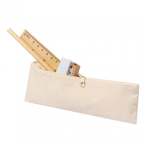 Zestaw szkolny, linijka, ołówek, gumka i temperówka, piórnik zamykany na zamek z bawełny z recyklingu