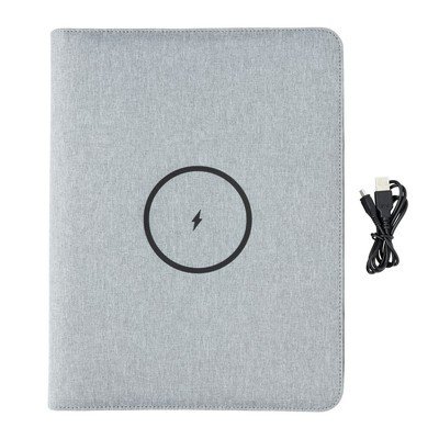 Teczka konferencyjna z notatnikiem A4 (20 kremowych kartek 70 g/m2 w linie), okładka wykonana z przyjaznego środowisku materiału rPET, bezprzewodowy power bank 5000 mAh, ładowarka bezprzewodowa 5W na przedniej okładce, 2 wyjścia USB do ładowania za pomocą kabla, bezprzewodowe ładowanie jest kompatybilne ze wszystkimi urządzeniami posiadającymi możliwość ładowania indukcyjnego, wejście 5V/2.1A, wyjście 1: 5V/2.1A, wyjście 2: 5V/2.1A, wyjście bezprzewodowe 5W, wzór zastrzeżony®