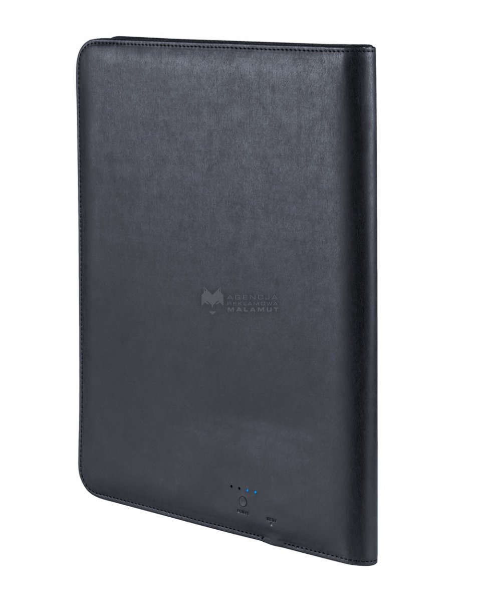 Teczka na dokumenty ze skóry PU z power bankiem 5000 mAh, notatnikiem 20 kartkowym i uchwytem na telefon oraz tablet. W zestawie kabel USB do ładowania.