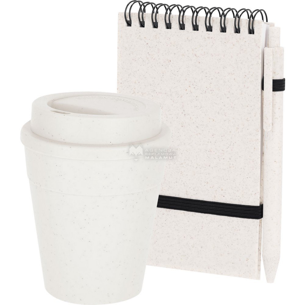 Zestaw biurowy, kubek podróżny 370 ml, notatnik, posiada 70 kartek w linie, elastyczna okładka, długopis z wkładem w niebieskim kolorze, produkt wykonany ze słomy pszenicznej i PP