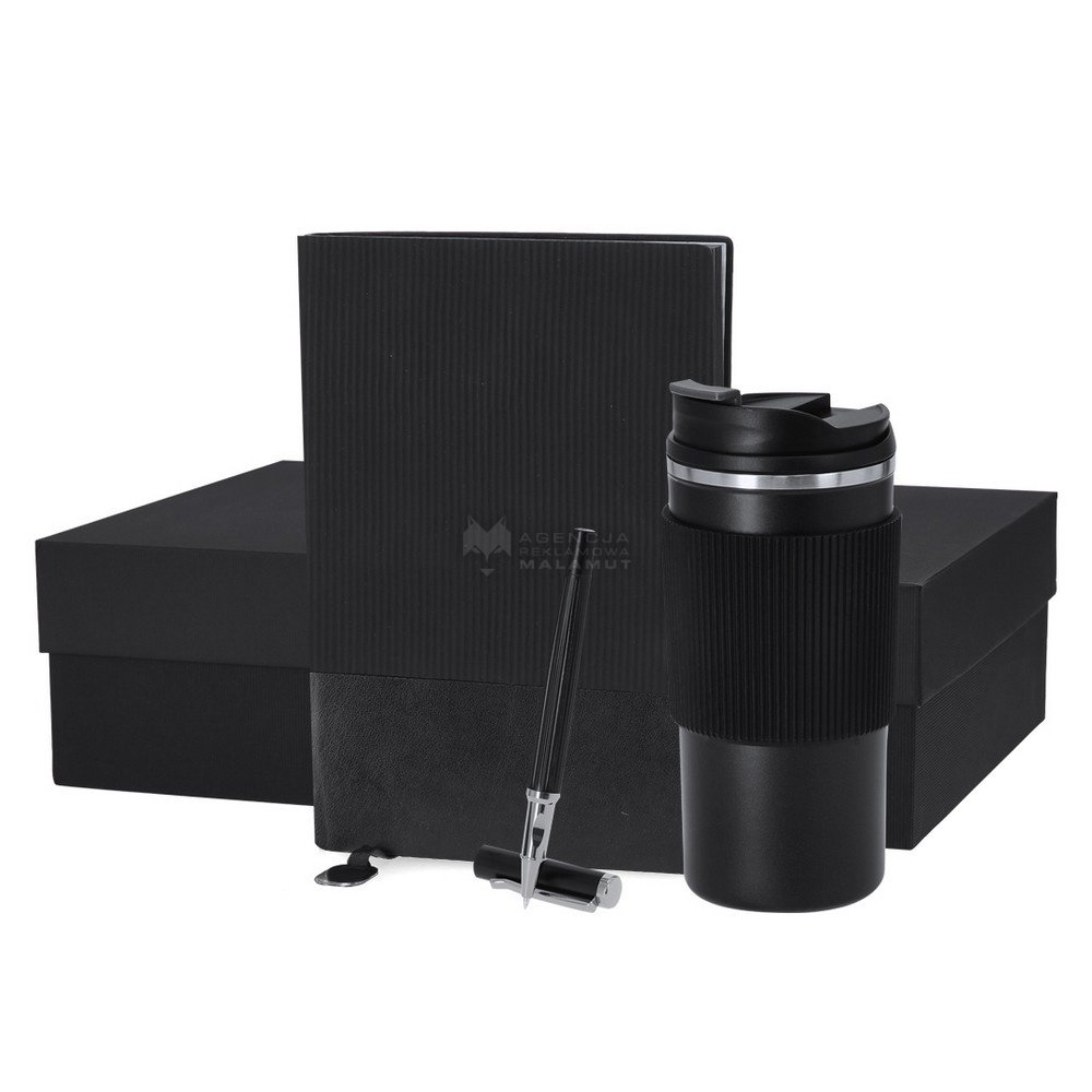 Zestaw upominkowy, w zestawie kubek termiczny 470 ml, posiada podwójne ścianki, które spowalniają oddawanie temperatury na zewnątrz, silikonowy uchwyt zwiększający wygodę użytkowania, notatnik w formacie ok. A5 z miękką okładką, posiada 100 kartek w linie oraz tasiemkę zakładkową ze specjalną metalową płytką pod znakowanie, tasiemka zakładkowa umożliwia wygodne zaznaczanie ostatniej strony lub ważniejszych notatek, pióro kulkowe posiada wkład w niebieskim kolorze, czarne pudełko podarunkowe w komplecie, produkt wykonany z między innymi aluminium, stali nierdzewnej, PU oraz PP
