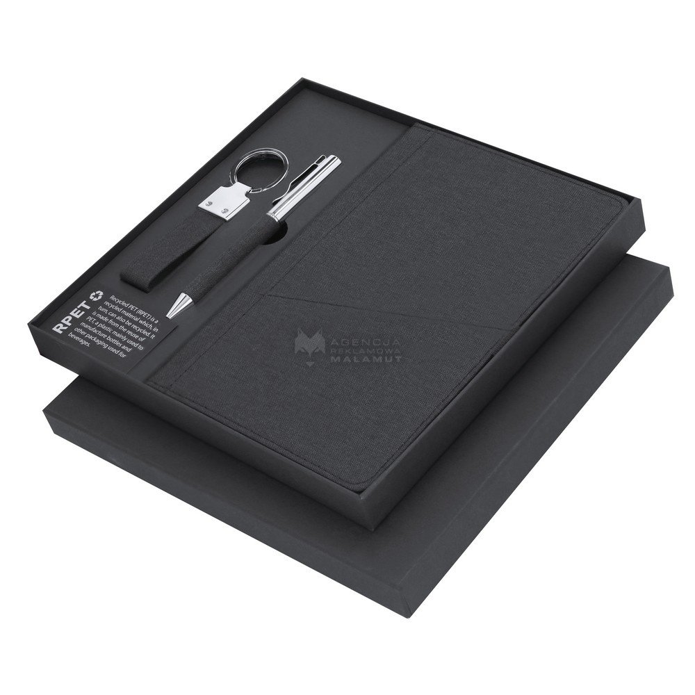 Zestaw upominkowy, w zestawie brelok, notatnik w formacie ok. A5, posiada 100 kartek w linie i twardą okładkę, długopis posiada wkład w niebieskim kolorze, czarne pudełko podarunkowe w komplecie, produkt wykonany z poliestru RPET oraz metalu