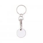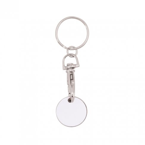 Brelok do kluczy z karabińczykiem umożliwiającym przypinanie, posiada wyjmowany żeton do wózka na zakupy w rozmiarze 1 zł, produkt wykonany z metalu