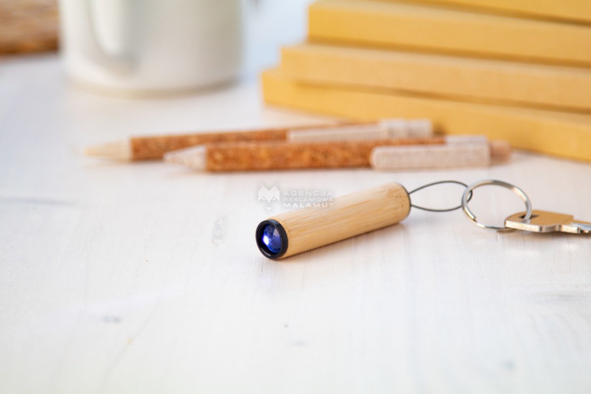Bambusowa mini latarka z białą diodą LED i metalowym brelokiem. Z baterią guzikową.