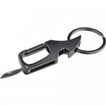 Brelok do kluczy, otwieracz do butelek z karabińczykiem umożliwiającym przypinanie, wyposażony w mały nóż, który sprawdzi się przy otwieraniu pudełek, zapakowany w brązową kopertę kartonową, produkt wykonany z metalu