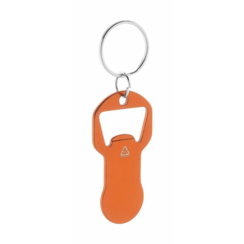 Brelok z otwieraczem do butelek wykonany z recyklingowanego aluminium, z żetonem do wózka sklepowego.