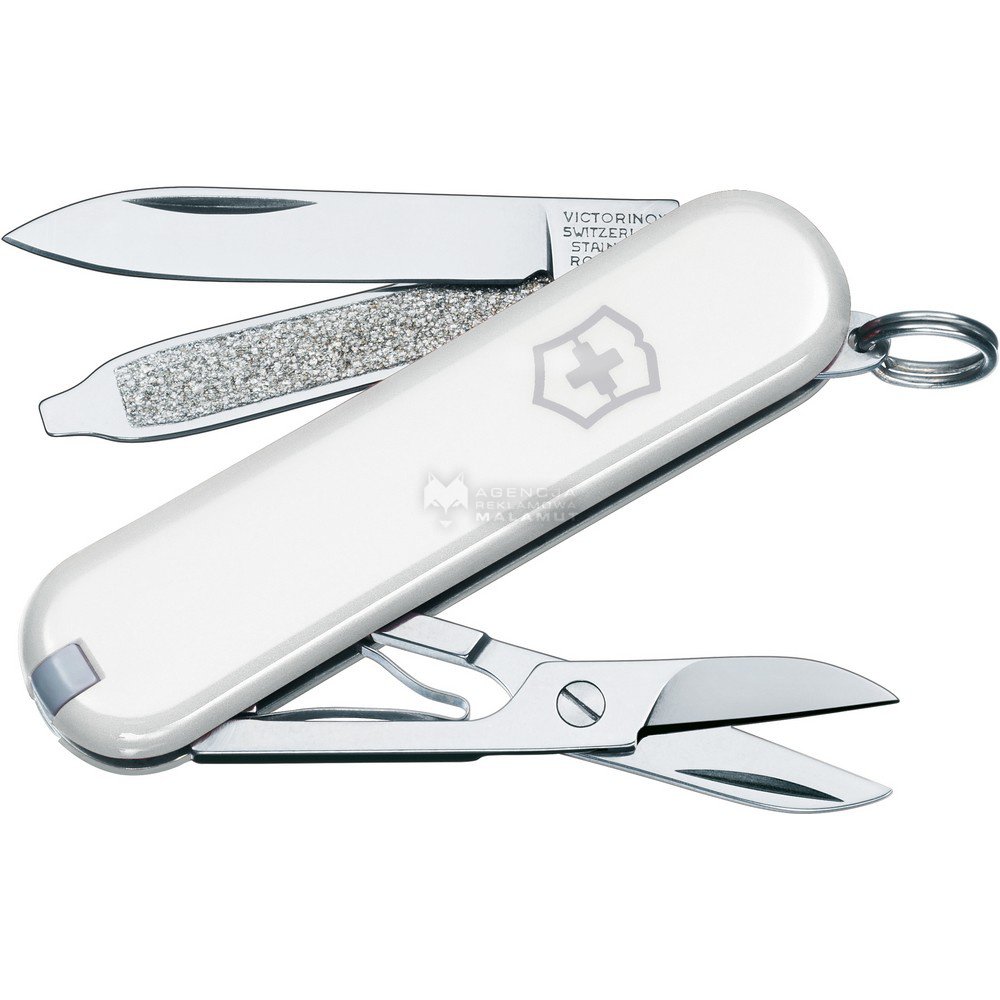 Narzędzie wielofunkcyjne Victorinox Classic SD z 7 funkcjami: wykałaczką, nożyczkami, pęsetą, pilnikiem do paznokci, śrubokrętem (2,5 mm), brelokiem do kluczy i małym ostrzem, zapakowane w pudełko upominkowe, produkt wykonany z ABS i metalu