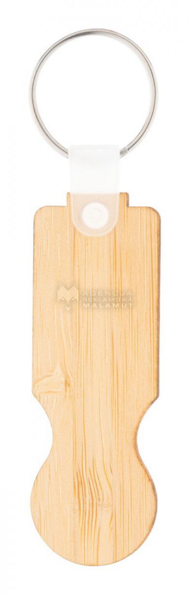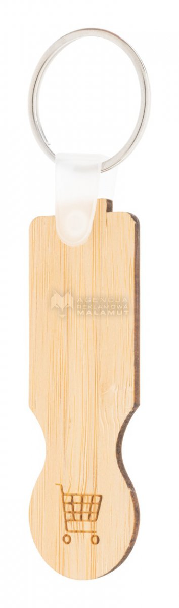 Brelok wykonany ze sklejki bambusowej z żetonem do wózka sklepowego.