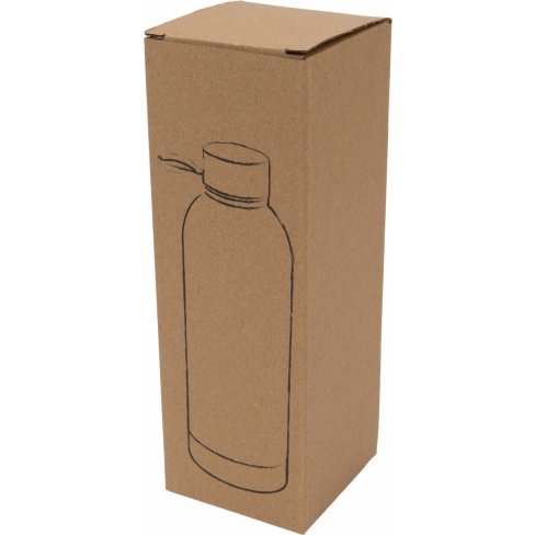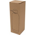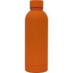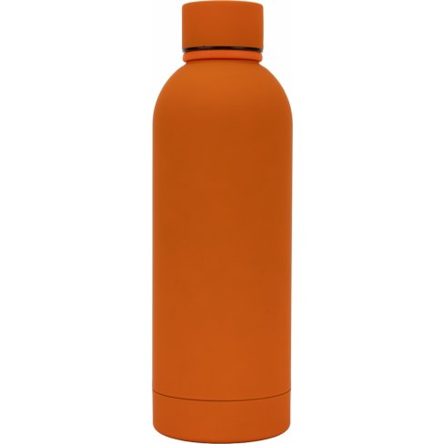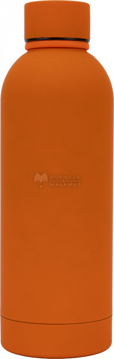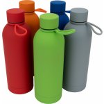 Stalowa butelka z gumowaną powierzchnią oraz pętelką do przenoszenia.