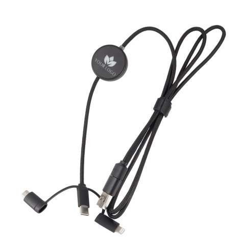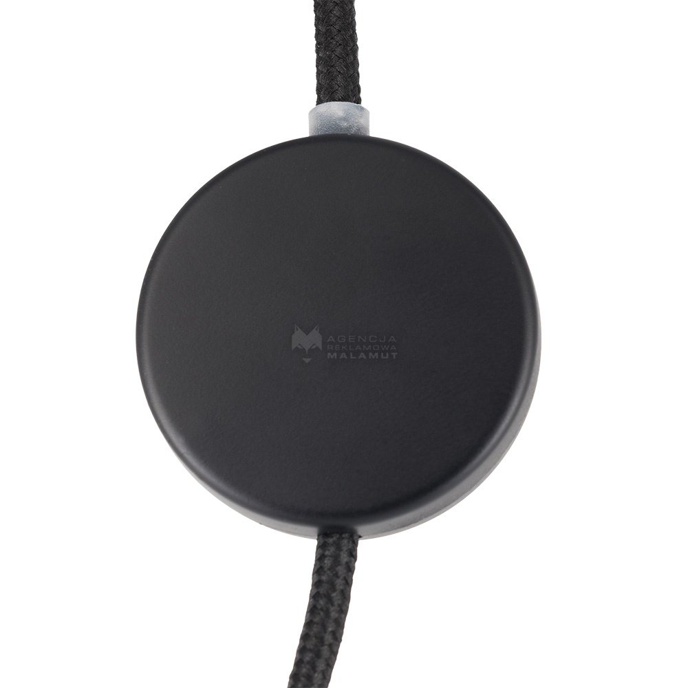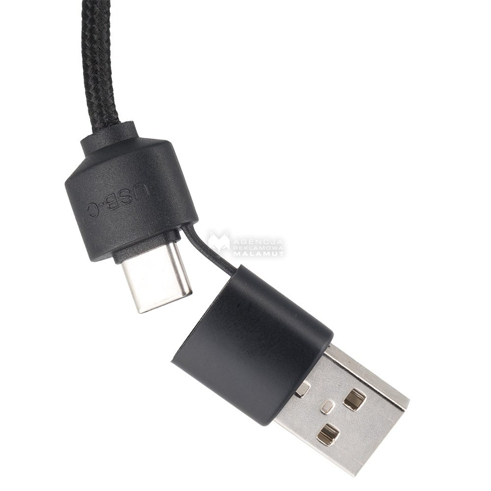 Długi kabel z 3 końcówkami w formie przjściówek type C/lightning/micro USB i wejściem do ładowania USB/type C. Po wygrawerowaniu logo jest podświetlone od spodu.