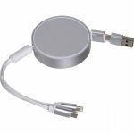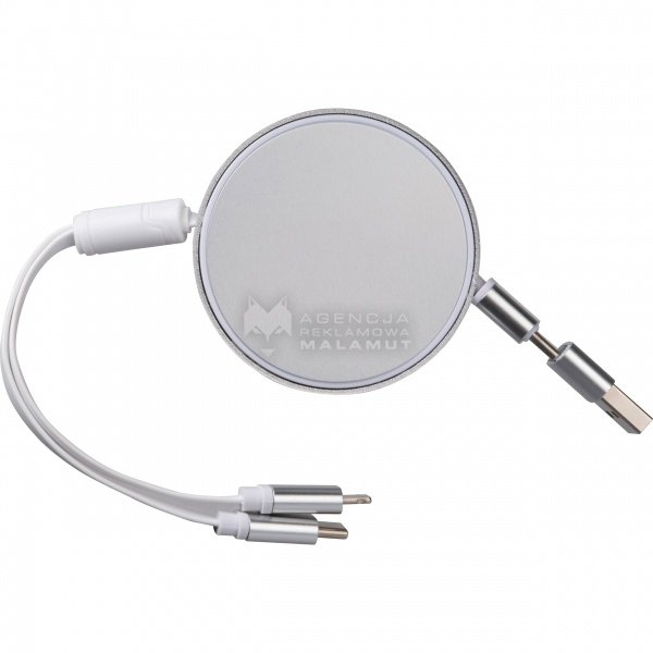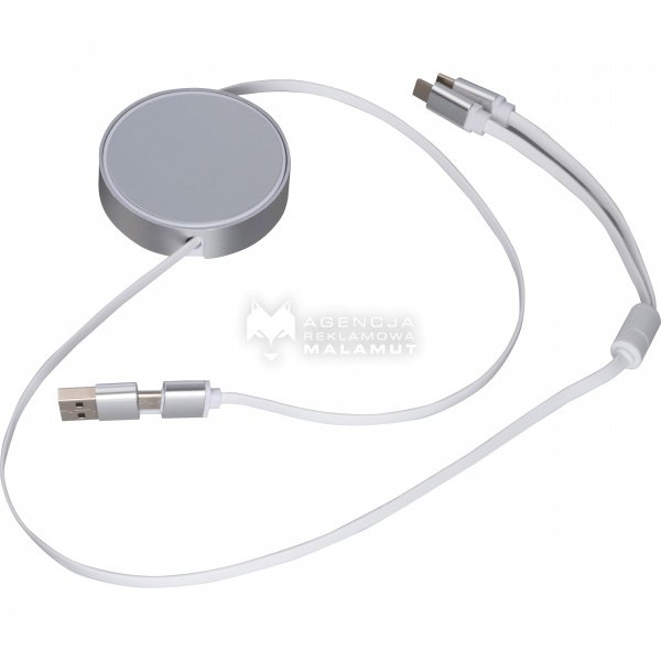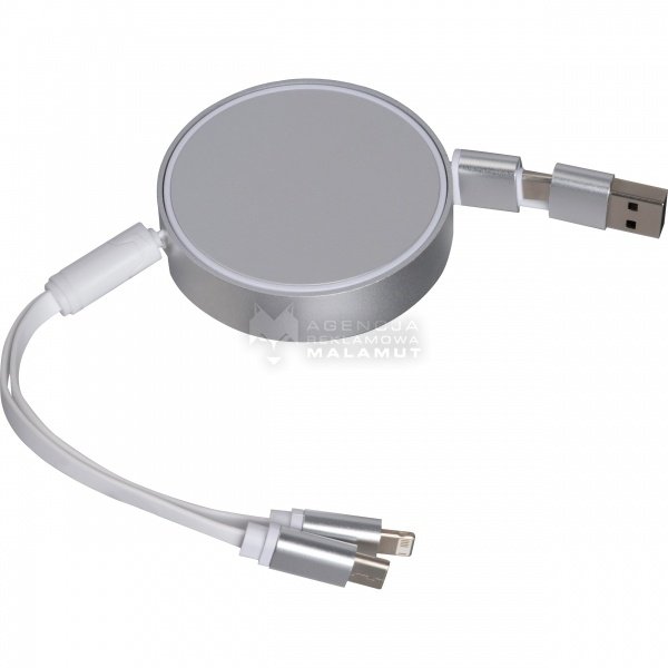 Zwijany kabel do ładowania z portem USB/type C i końcówkami do ładowania type C i lightning.