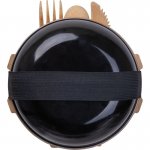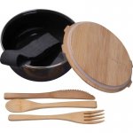 Metalowy lunchbox o pojemności 700 ml, z bambusową pokrywką do której za pomocą gumki zamocowany jest komplet bambusowych sztućców - łyżka, nóż i widelec.