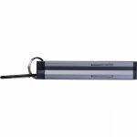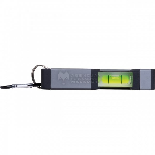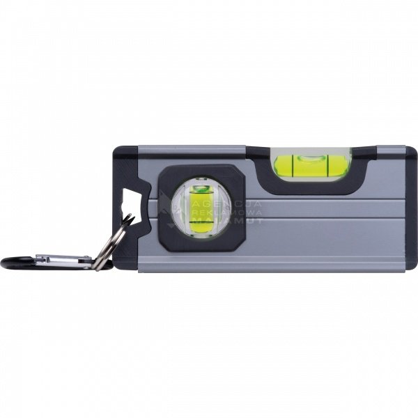 Mini poziomnica wykonana z aluminium z aplikacjami z plastiku ABS, dwiema libellami, magnesem na spodzie i karabińczykiem.