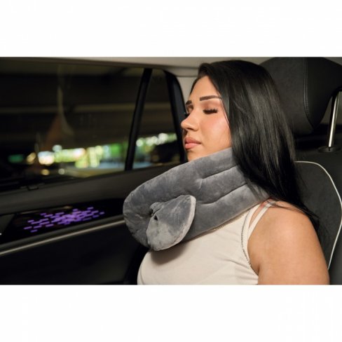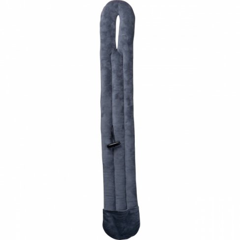 Przytulna poduszka na szyję wykonana z aksamitnego weluru. Pasek zapięcia umożliwia łatwe zabezpieczenie poduszki po zwinięciu.
