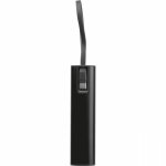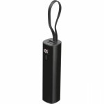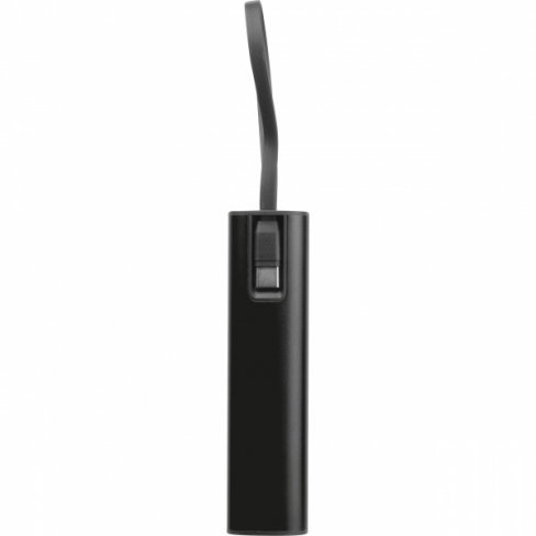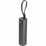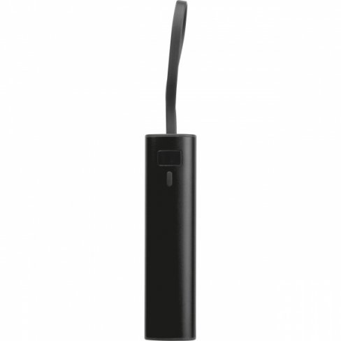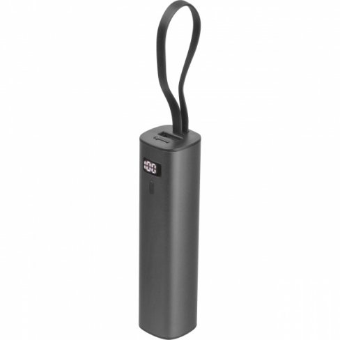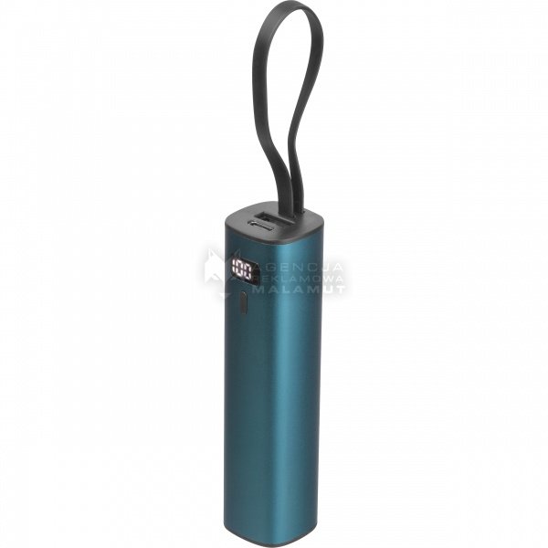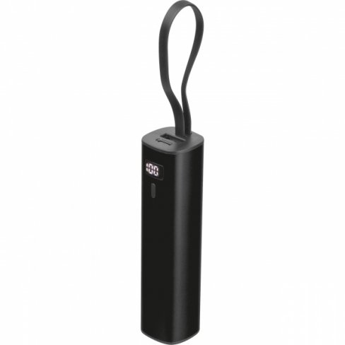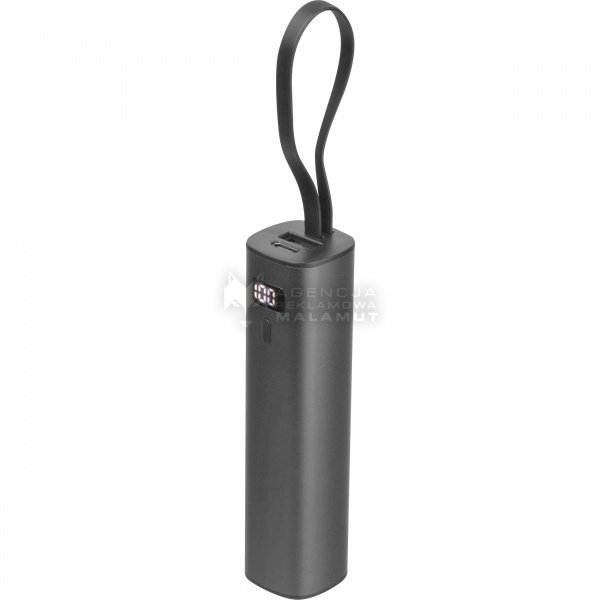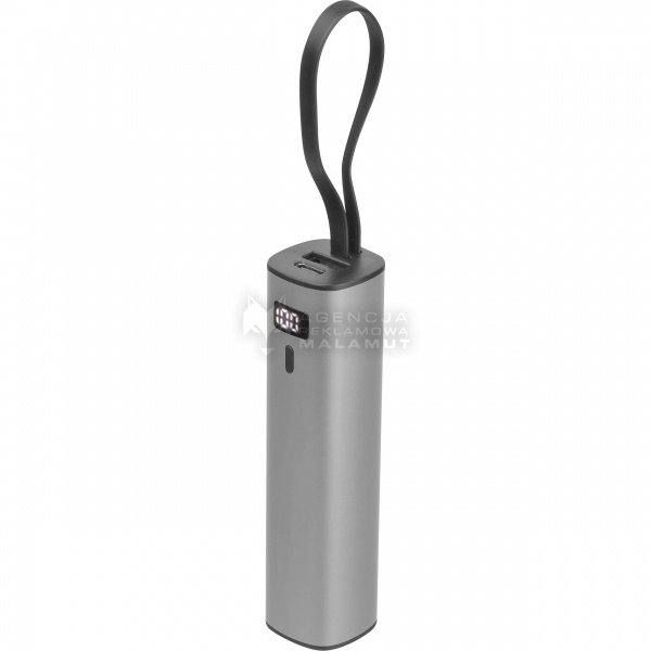 Power bank wykonany z aluminium z akumulatorem Li-ion 5000 mAh, wyświetlaczem poziomu naładowania i zintegrowanym kablem ładującym USB-C. W zestawie kabel ładujący Type-A do Type-C o długości 30 cm.