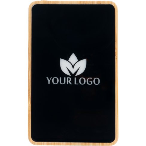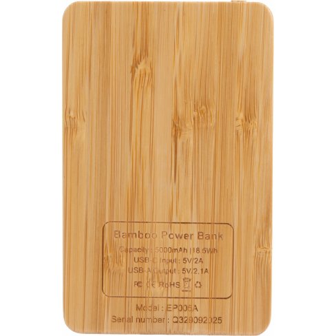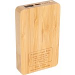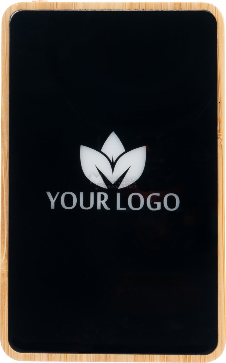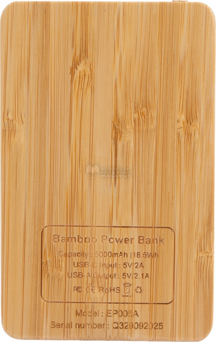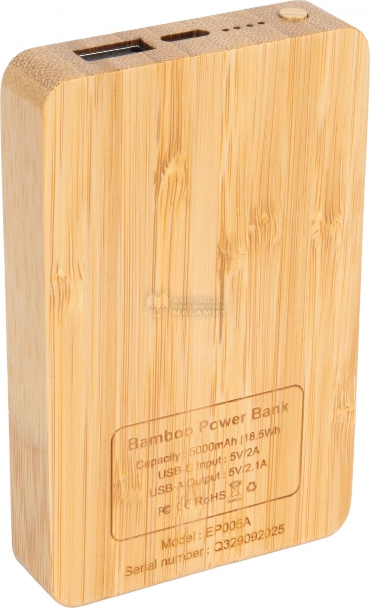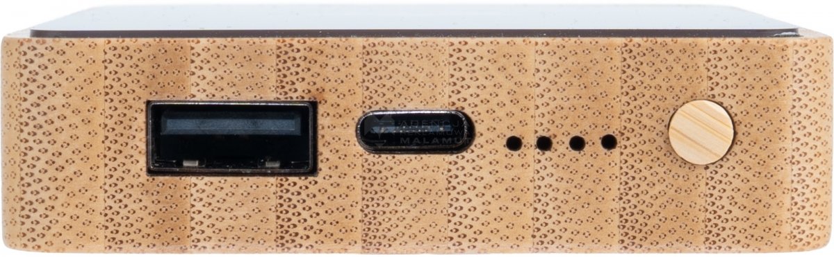 Bambusowy power bank o pojemności 5000 mAh łączy naturalny design z nowoczesną technologią. Grawerowane logo po włączeniu urządzenia elegancko się podświetla, tworząc efektowny akcent wizualny. Cztery diody LED na obudowie informują o aktualnym poziomie naładowania, a port USB-C (wejście/wyjście 5V/2A) oraz klasyczny port USB (5V/2A) zapewniają szybkie i niezawodne ładowanie. W zestawie znajduje się kabel USB-C, dzięki czemu power bank jest gotowy do użycia od razu po wyjęciu z pudełka.