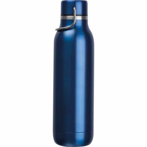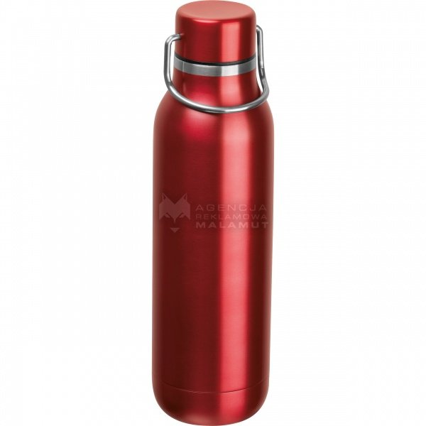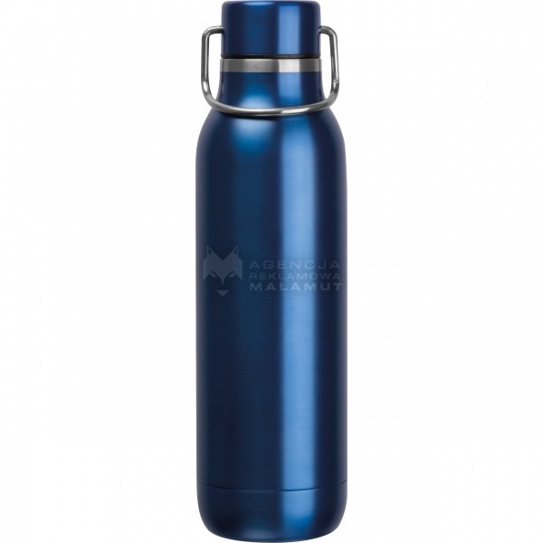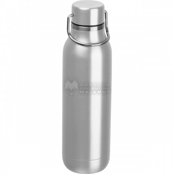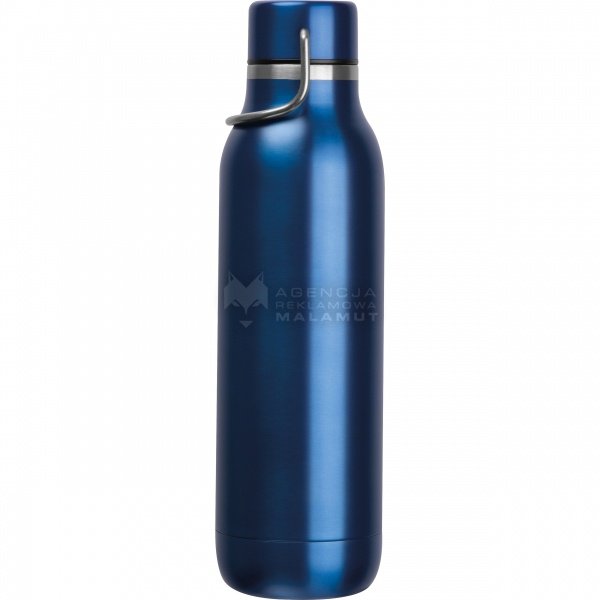 Butelka do picia ze stali nierdzewnej z podwójnymi ściankami z uchwytem do noszenia na pokrywce i pojemnością 600 ml.