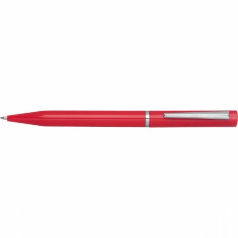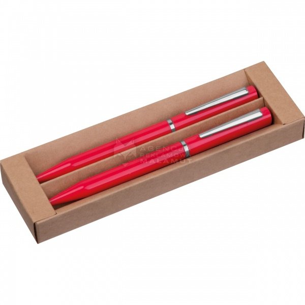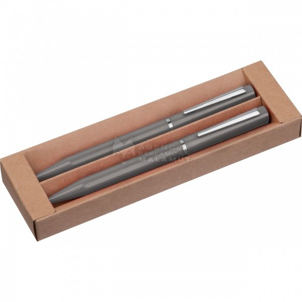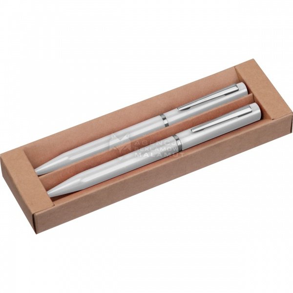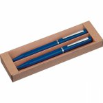 Zestaw do pisania składający się z obrotowego długopisu z niebieskim atramentem, obrotowego długopisu bez atramentu i kartonowego pudełka. Oba długopisy są wykonane z recyklingowego ABS.