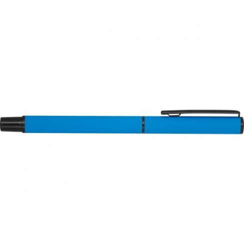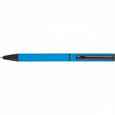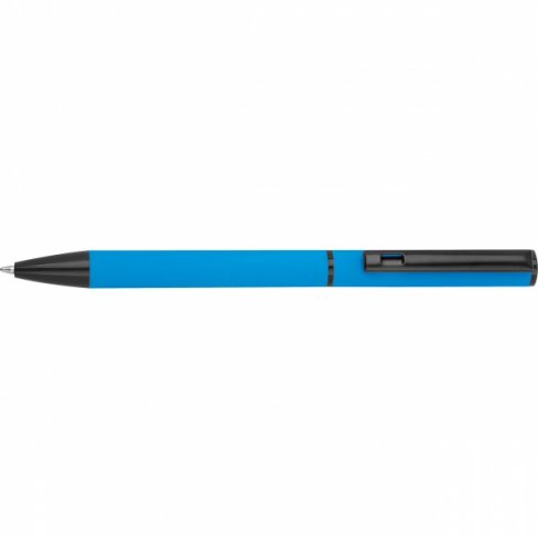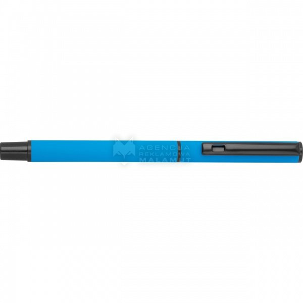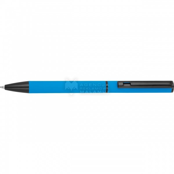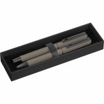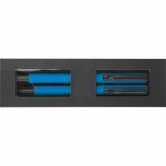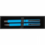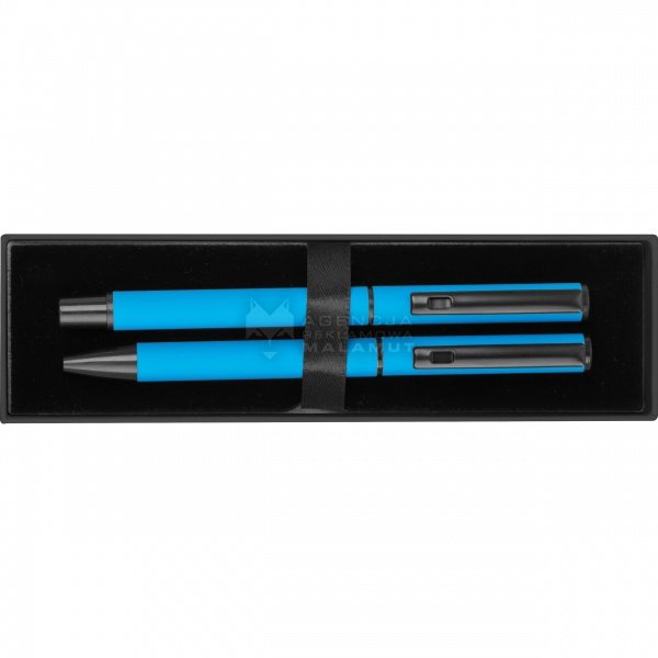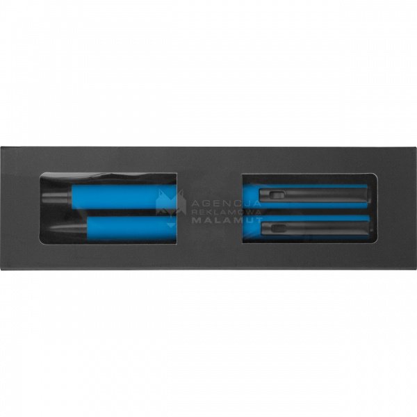 Zestaw do pisania składający się z długopisu kulkowego z czarnym atramentem i obrotowego długopisu z niebieskim atramentem, zapakowany w pudełko.