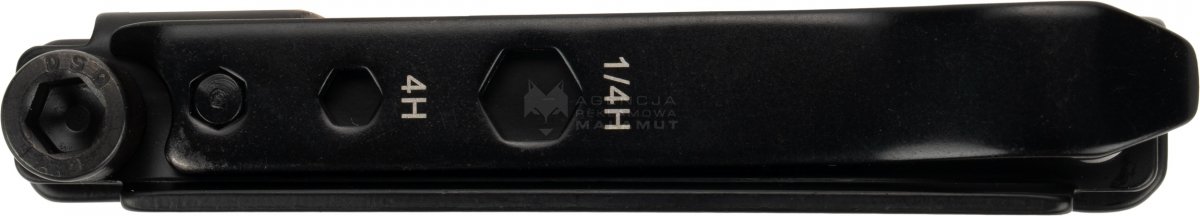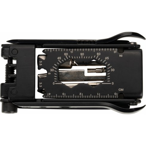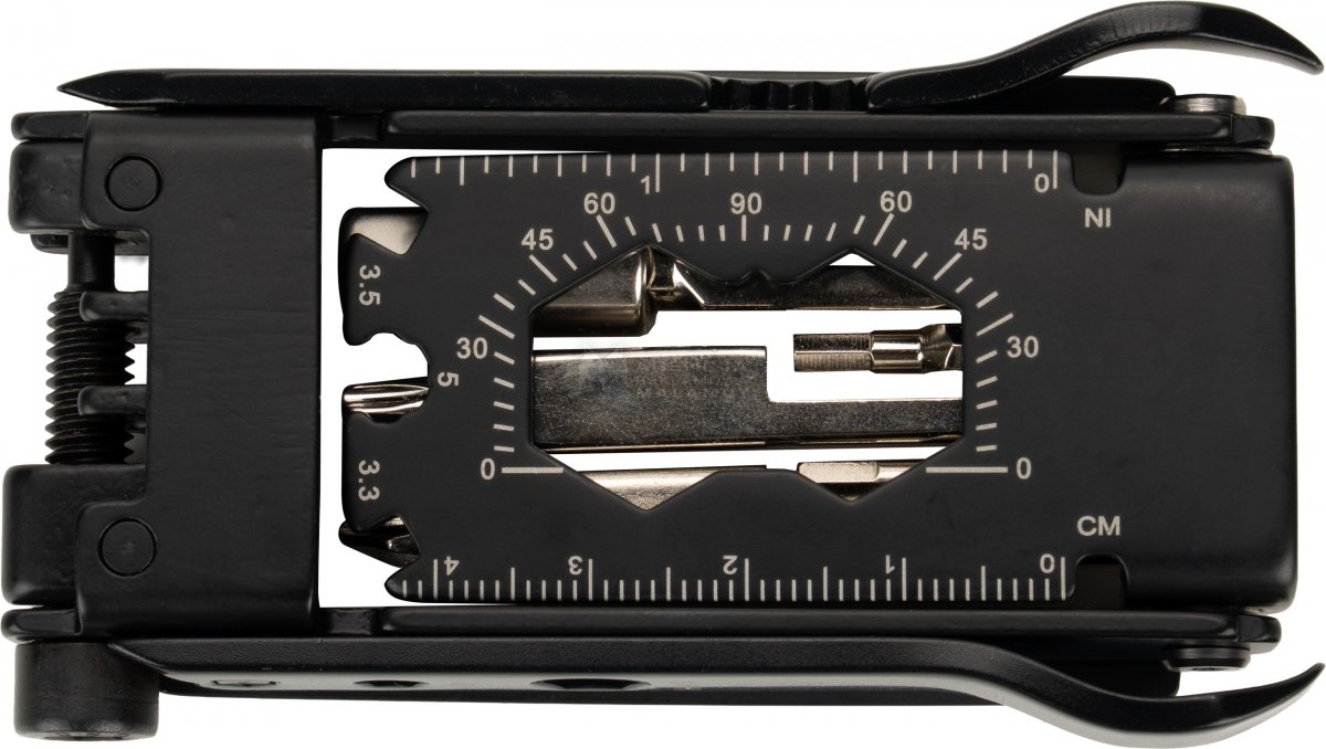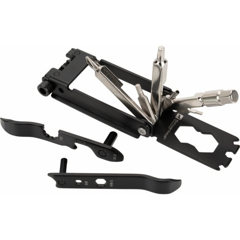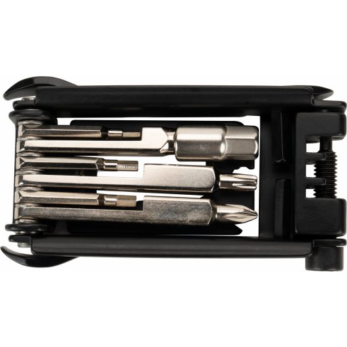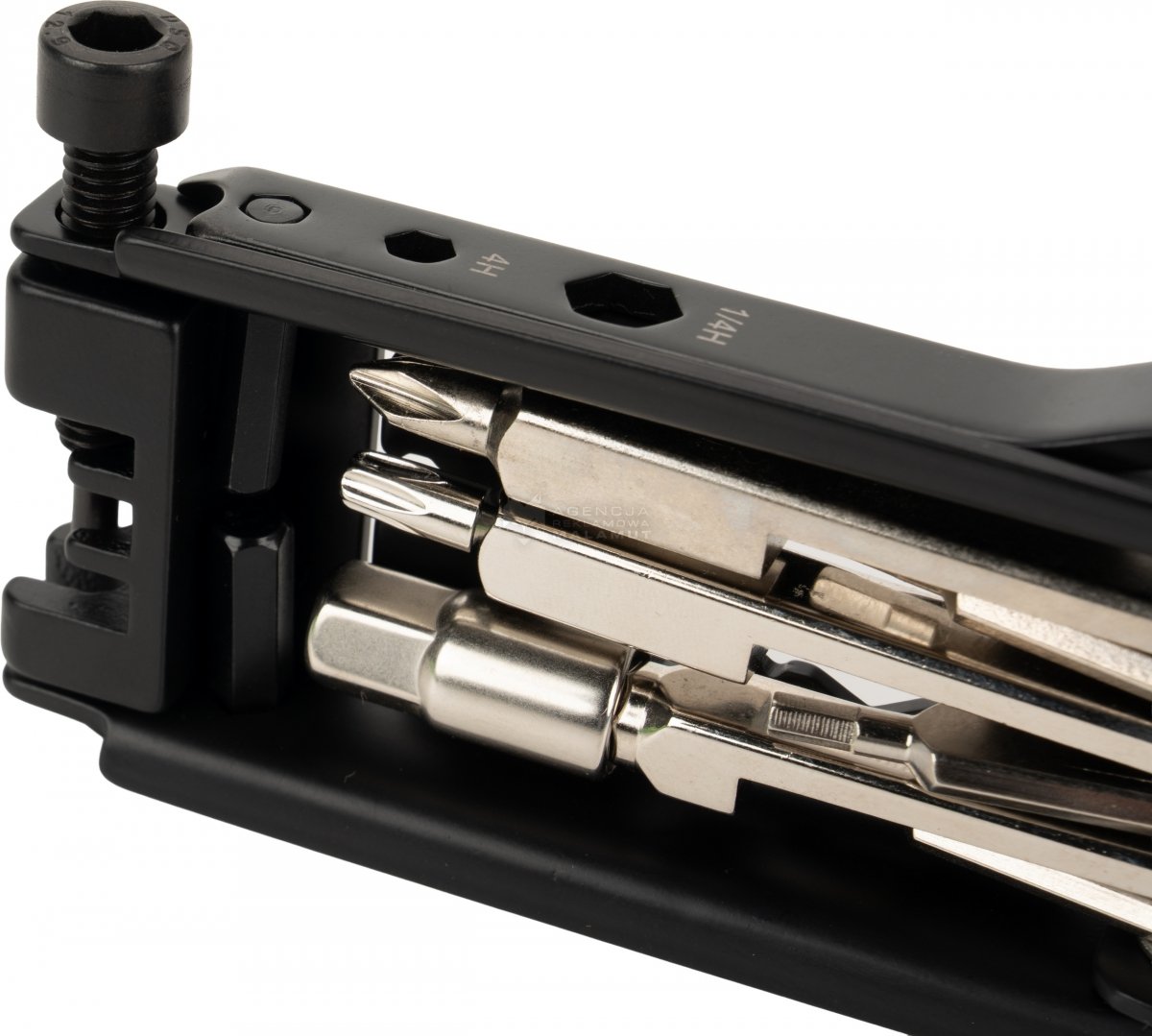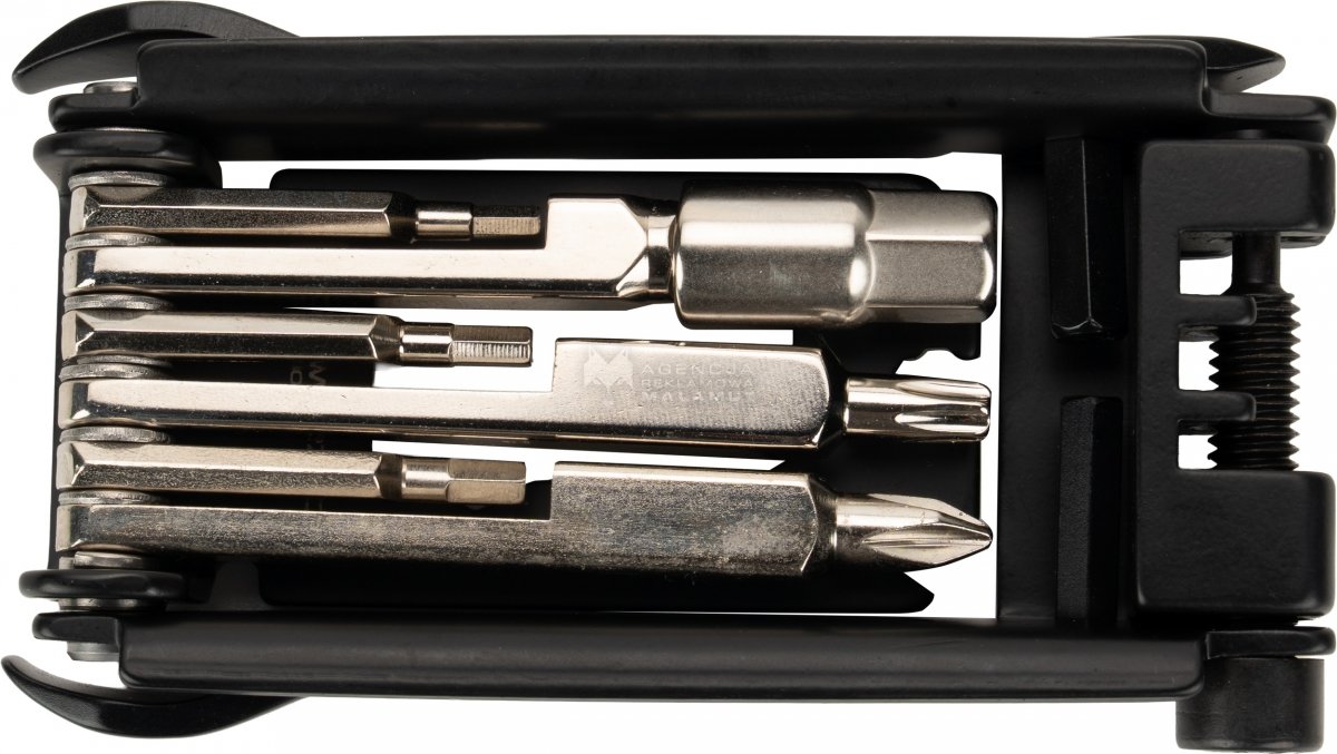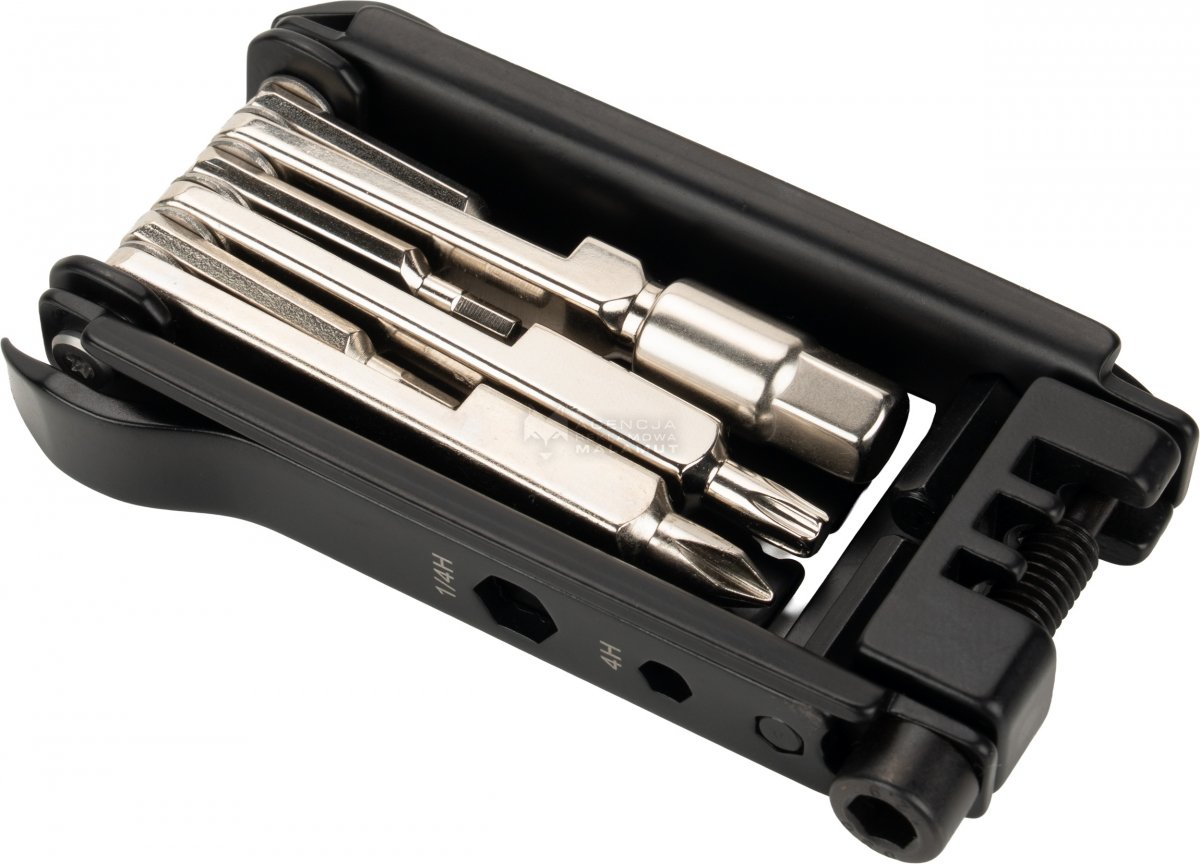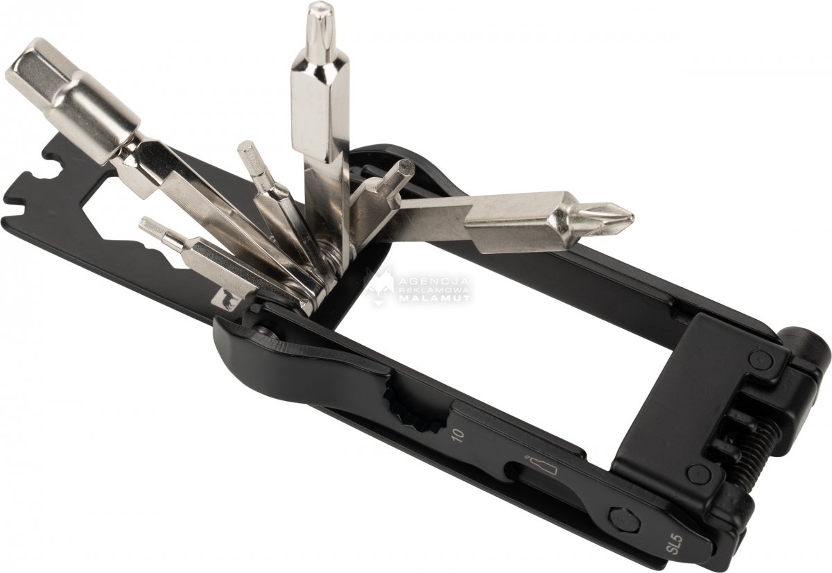 Wielofunkcyjne narzędzie dla rowerzystów. Zawiera 22 narzędzia: śrubokręt torx (3 rozmiary), otwieracz do butelek, śrubokręt płaski, śrubokręt krzyżakowy, 2 łyżki do opon, młotek do łańcuszka, klucz imbusowy (2 rozmiary), narzędzie do szprych (2 rozmiary), 2 linijki, klucz imbusowy (7 rozmiarów).