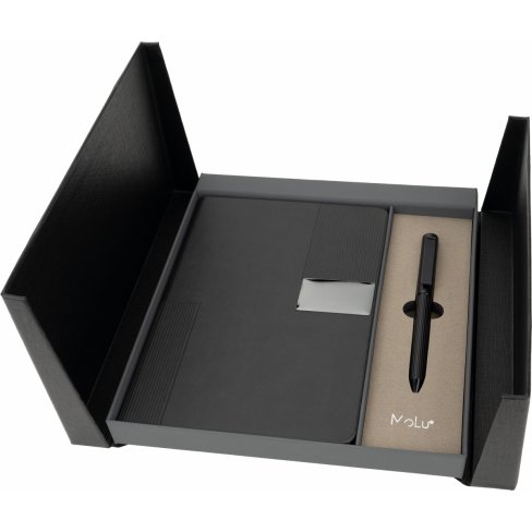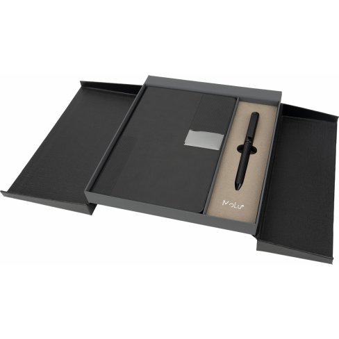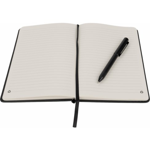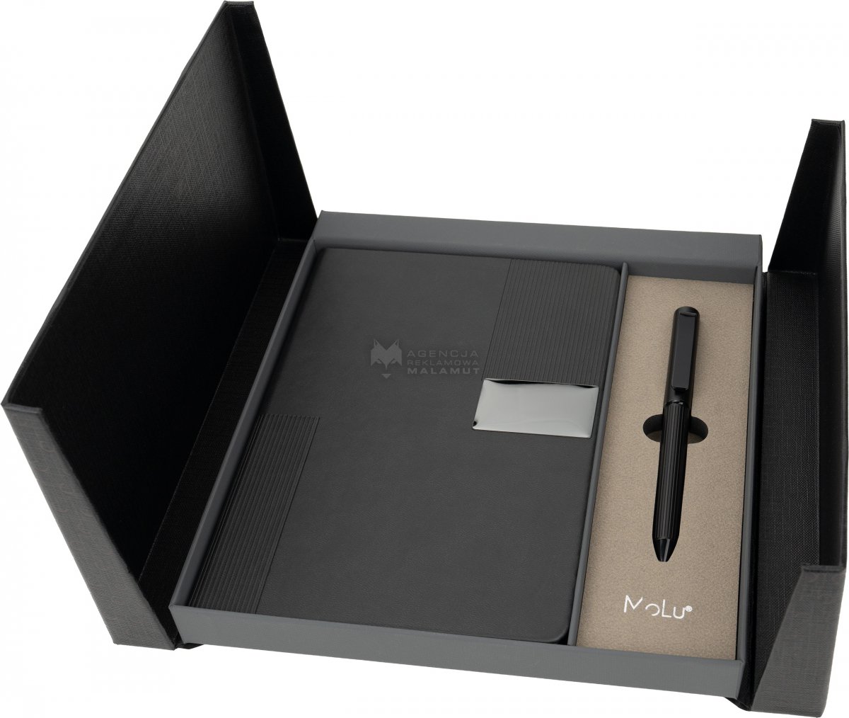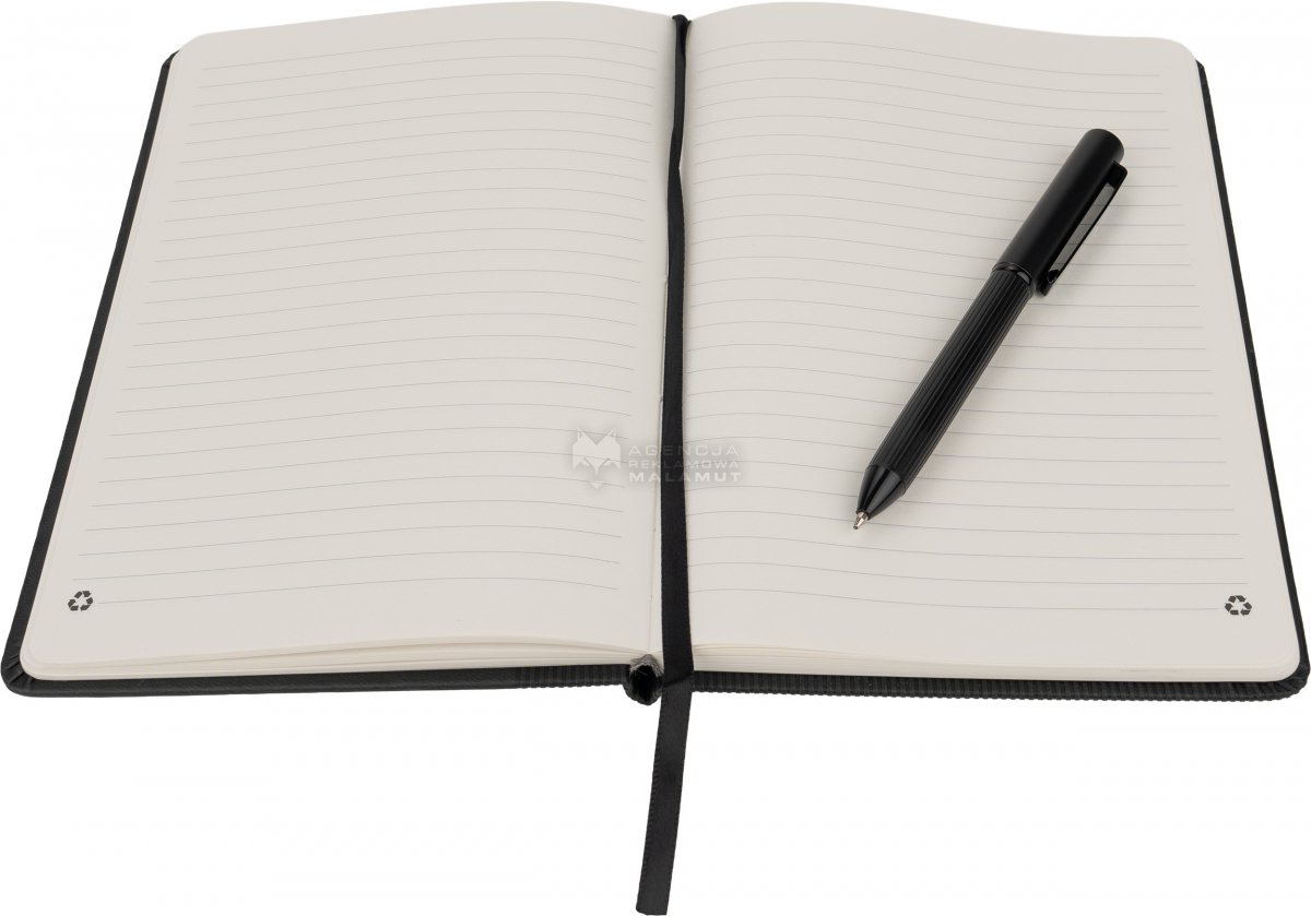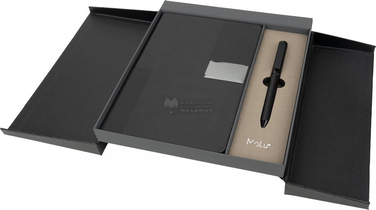 Zestaw od MoLu składający się z długopisu i notatnika ze 100 kartkami, wykonanymi z papieru z recyklingu.
