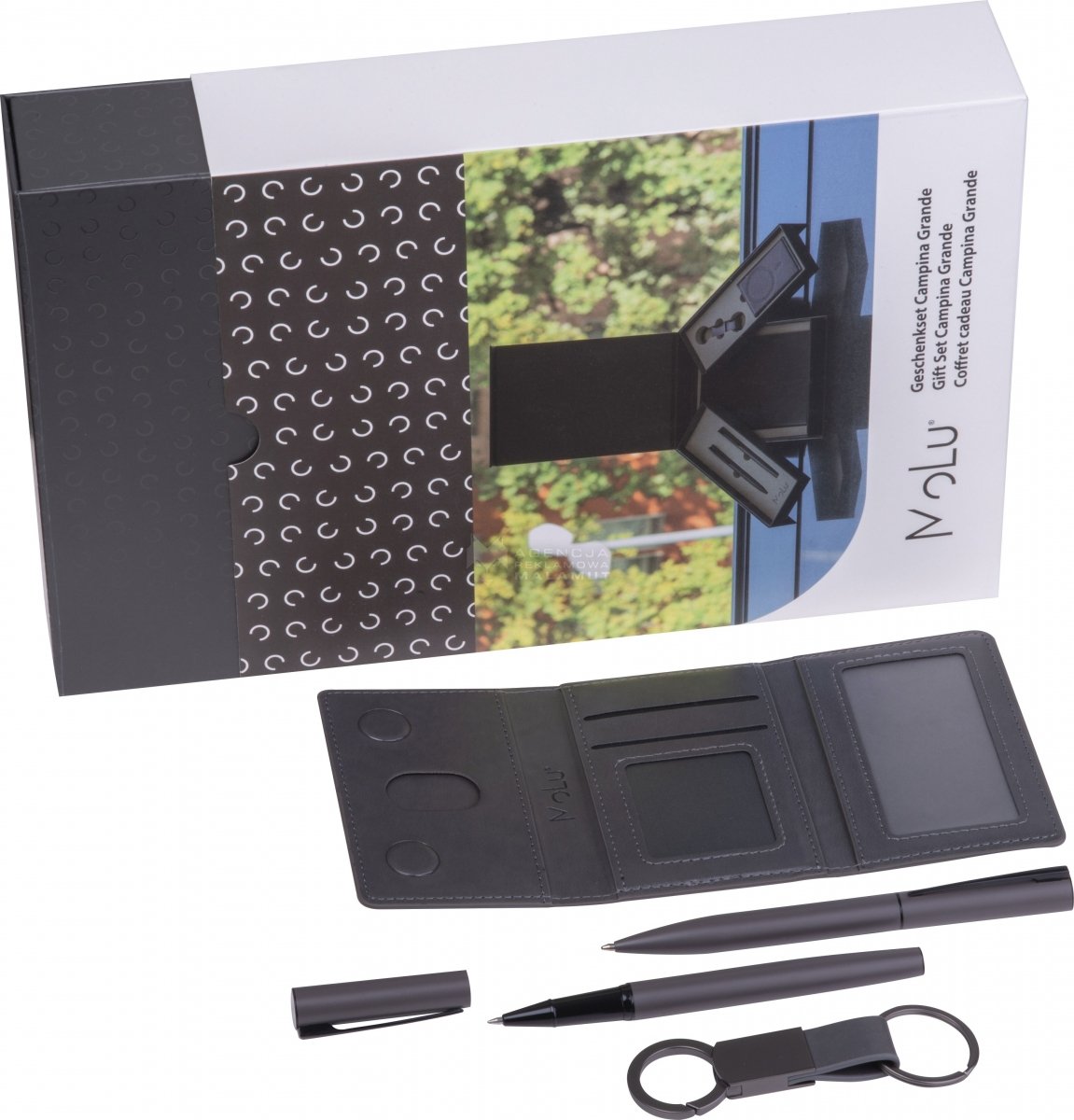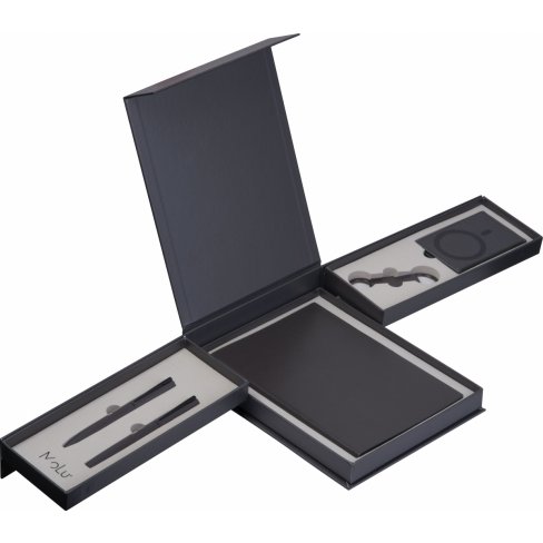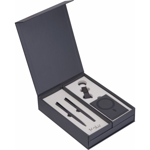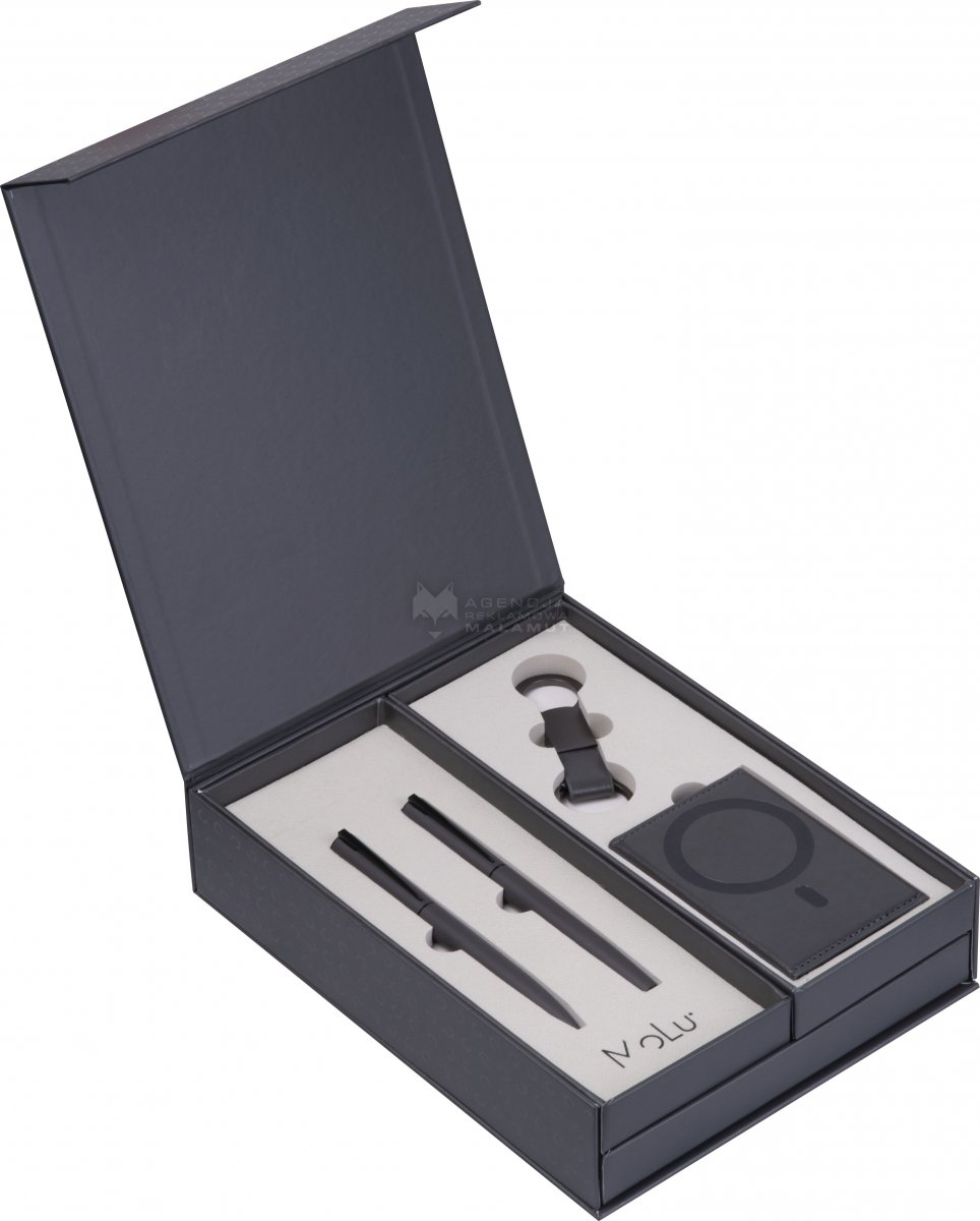 Zestaw upominkowy MoLu – zaprojektowany, by robić wrażenie. Wysokiej jakości notatnik, elegancki zestaw długopisów i magnetyczny uchwyt na karty. Wykonany w zrównoważony sposób z papieru pochodzącego z recyklingu, stylowo osadzony w szarej piance. Prezent odzwierciedlający prawdziwe wartości – przemyślany, ponadczasowy i reprezentacyjny.