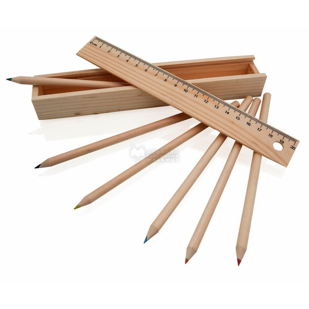 Zestaw szkolny w drewnianym pudełku, 6 kredek, zamknięcie z linijką (20 cm)