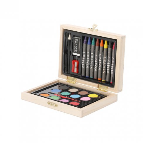 Zestaw do malowania i rysowania, 24 el., kredki, ołówek, gumka do mazania, temperówka, farbki akwarelowye, pędzelek, drewniane pudełko VA298