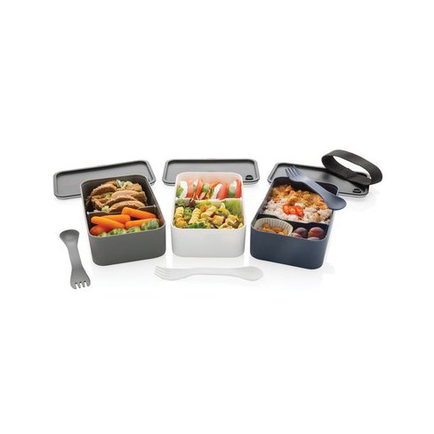 Pudełko śniadaniowe 1,2 L, lunchbox, wykonany w 93% z PP pochodzącego z recyklingu z certyfikatem GRS (Global Recycled Standard) który gwarantuje, że wykorzystane materiały pochodzą z recyklingu, w komplecie łyżkowidelec i elastyczny pasek, nie należy myć w zmywarce i używać w kuchence mikrofalowej