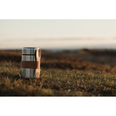 Próżniowy pojemnik na żywność, wykonany ze stali nierdzewnej, opaska oraz drewniana łyżka w komplecie