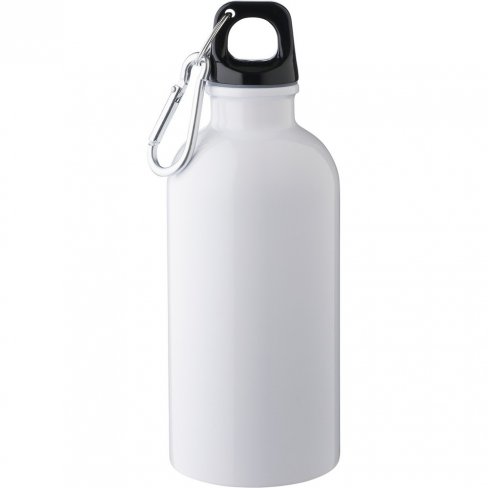 Butelka sportowa 400 ml, ikona recyklingu na produkcie, nie nadaje się do mycia w zmywarce, produkt wykonany ze stali nierdzewnej z recyklingu, nakrętka z PP, srebrny aluminiowy karabińczyk