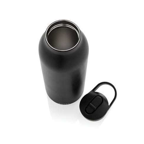 Butelka termiczna 500 ml, wykonana ze stali nierdzewnej pochodzącej z recyklingu, całkowita zawartość materiałów z recyklingu obliczona na podstawie wagi całkowitej przedmiotu: 96%, podwójne ścianki z próżnią pomiędzy, utrzymuje temperaturę napojów zimnych do 20 godzin, pasuje do większości uchwytów samochodowych, w pudełku z papieru kraftowego z certyfikatem FSC®, pudełko można wykorzystać jako stojak na telefon lub doniczkę, w pudełku z papieru kraftowego z certyfikatem FSC®, ślad węglowy produktu: 1,48 kg CO2