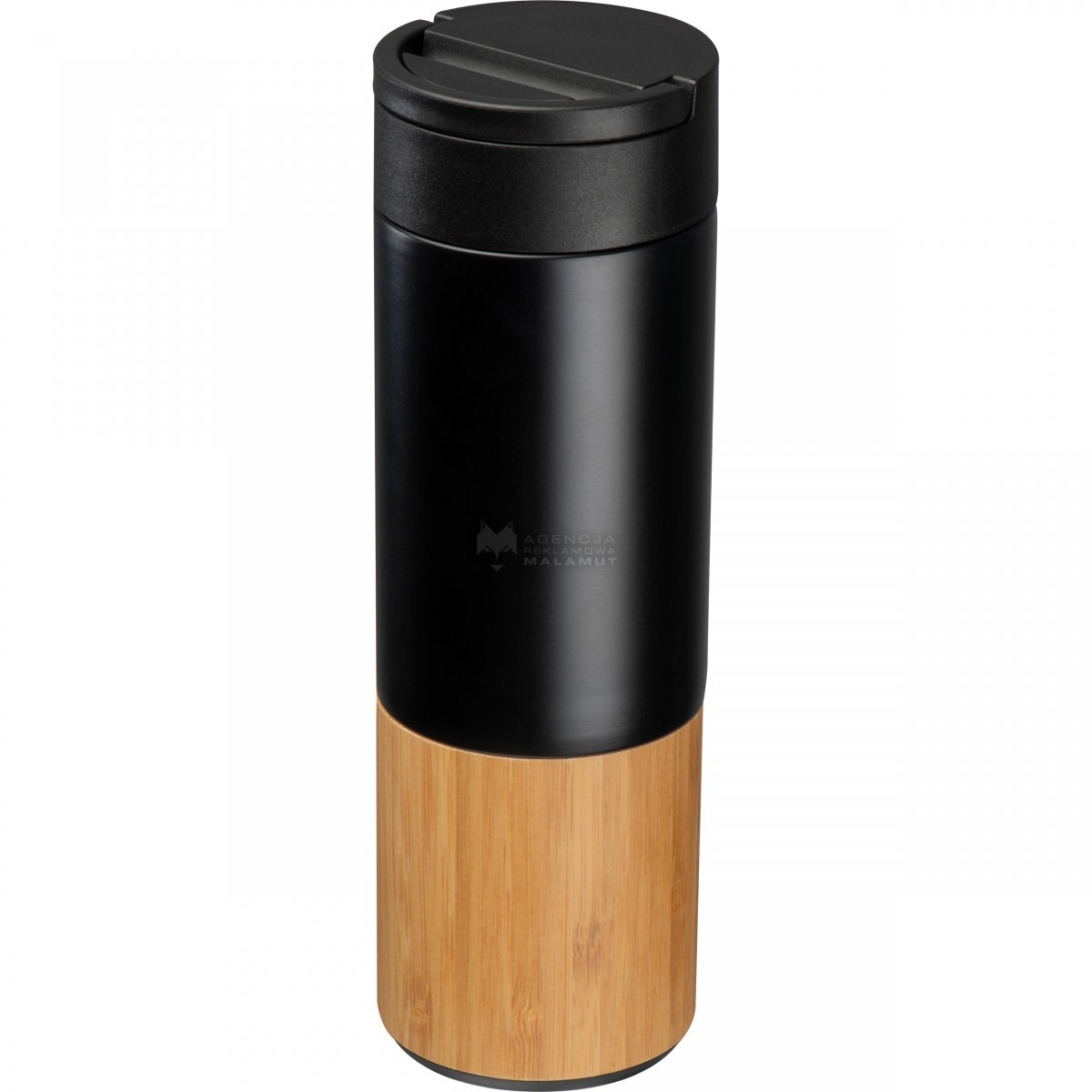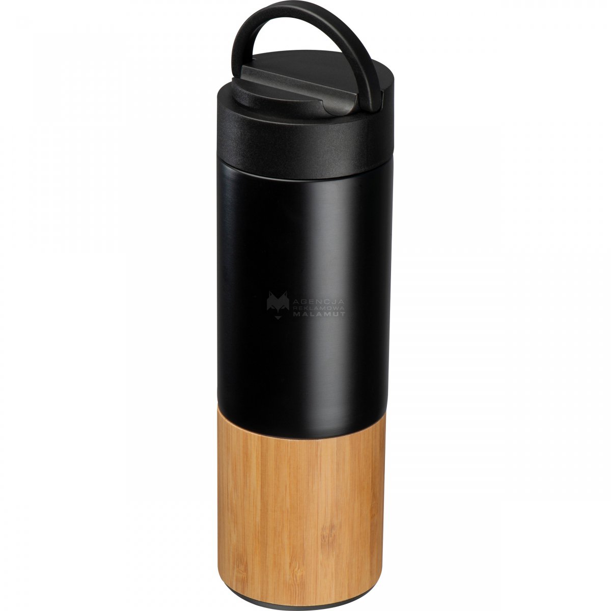 Miedziana butelka izolowana próżniowo z dolną częścią wykonaną z bambusa, szczelnym wieczkiem, uchwytem do przenoszenia i pojemnością 500 ml.