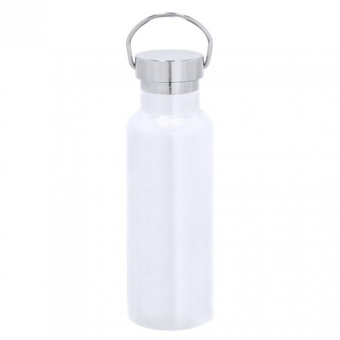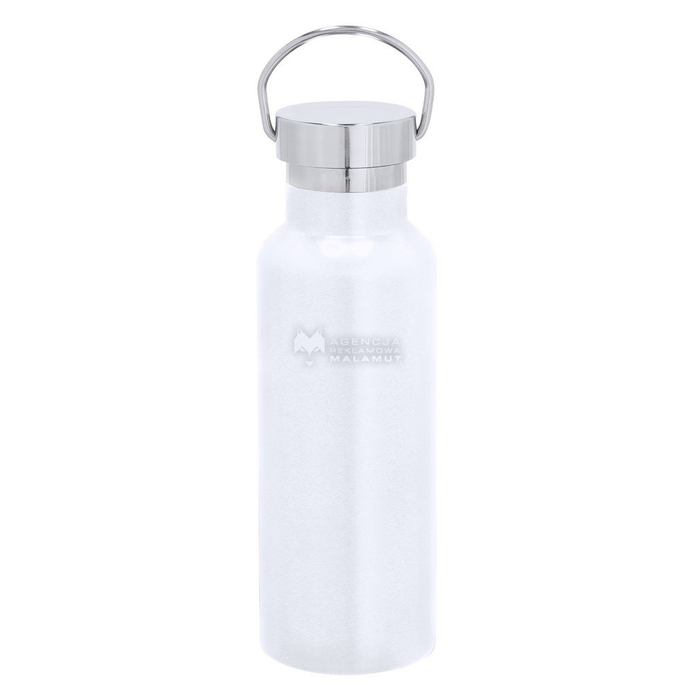 Butelka termiczna 500 ml z uchwytem ułatwiającym noszenie, podwójne ścianki ze stali nierdzewnej z próżnią między ściankami dzięki czemu długo utrzymuje temperaturę nie oddając jej na zewnątrz, produkt wykonany ze stali nierdzewnej z recyklingu z ceramiczną wewnętrzną powłoką
