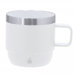 Kubek 180 ml z rączką, posiada ceramiczną powłokę wewnątrz oraz podwójne ścianki, które spowalniają oddawanie temperatury na zewnątrz, produkt wykonany z ceramiki i stali nierdzewnej z recyklingu