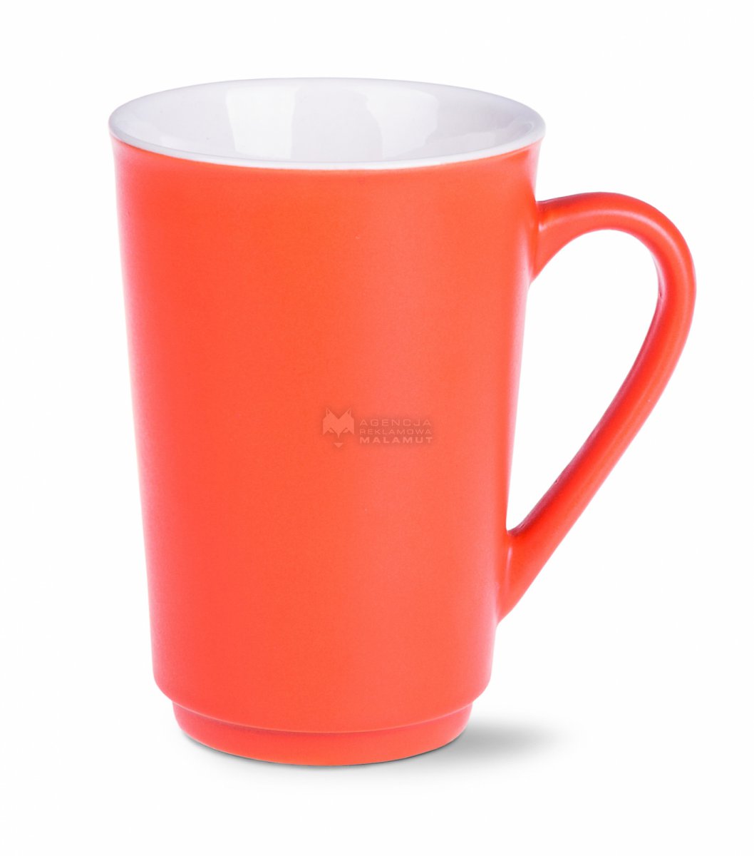 Kubek reklamowy o pojemności 240ml z satynową, kolorową powierzchnią na zewnątrz oraz białym wnętrzem.