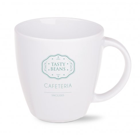 Porcelanowy kubek reklamowy dostępny w dwóch wersjach rozmiarowych. Cechą charakterystyczną tego fasonu są delikatne krawędzie widoczne w jego dolnej części.