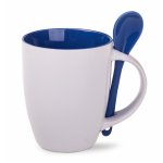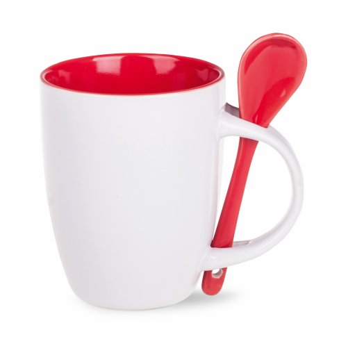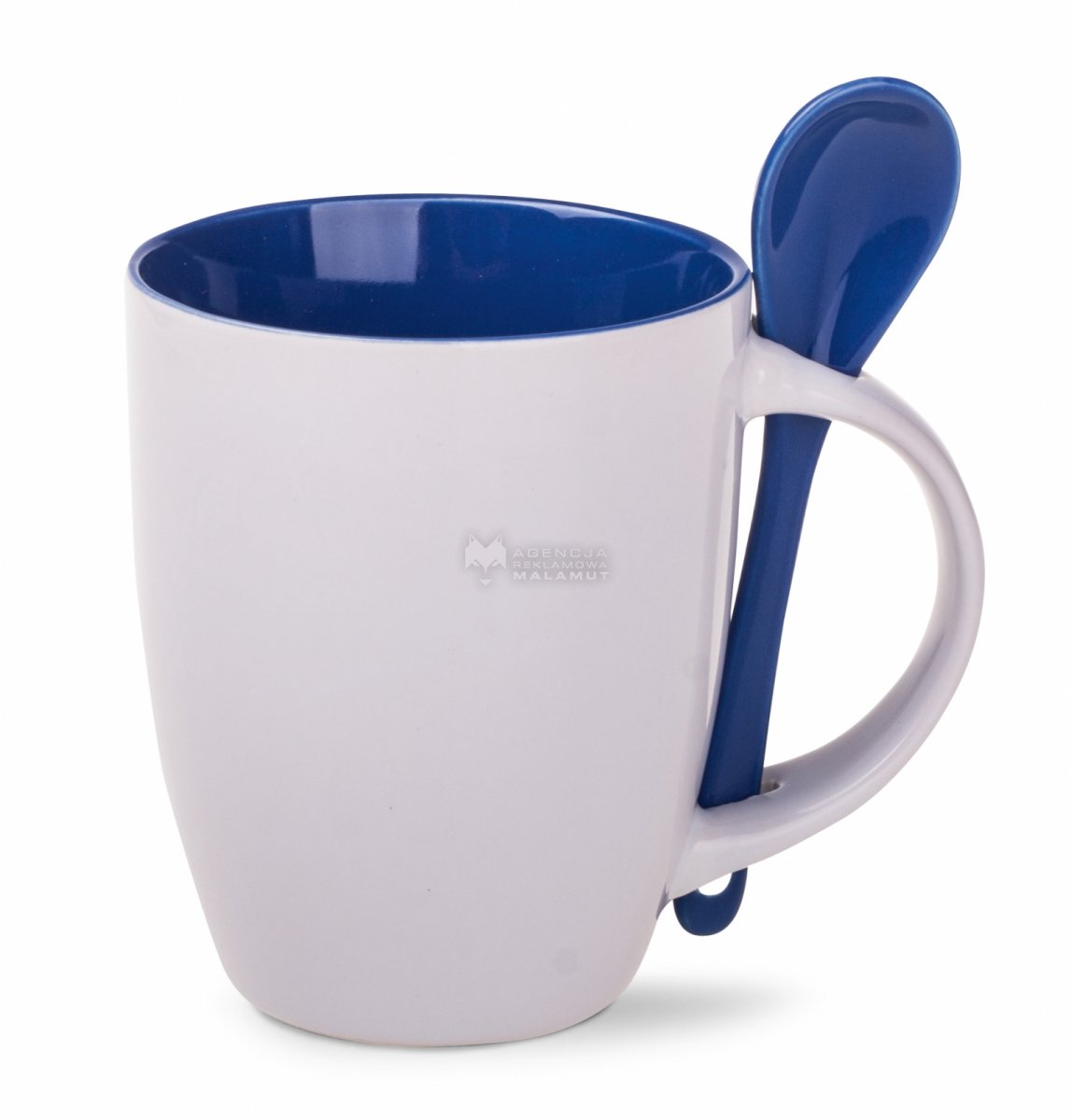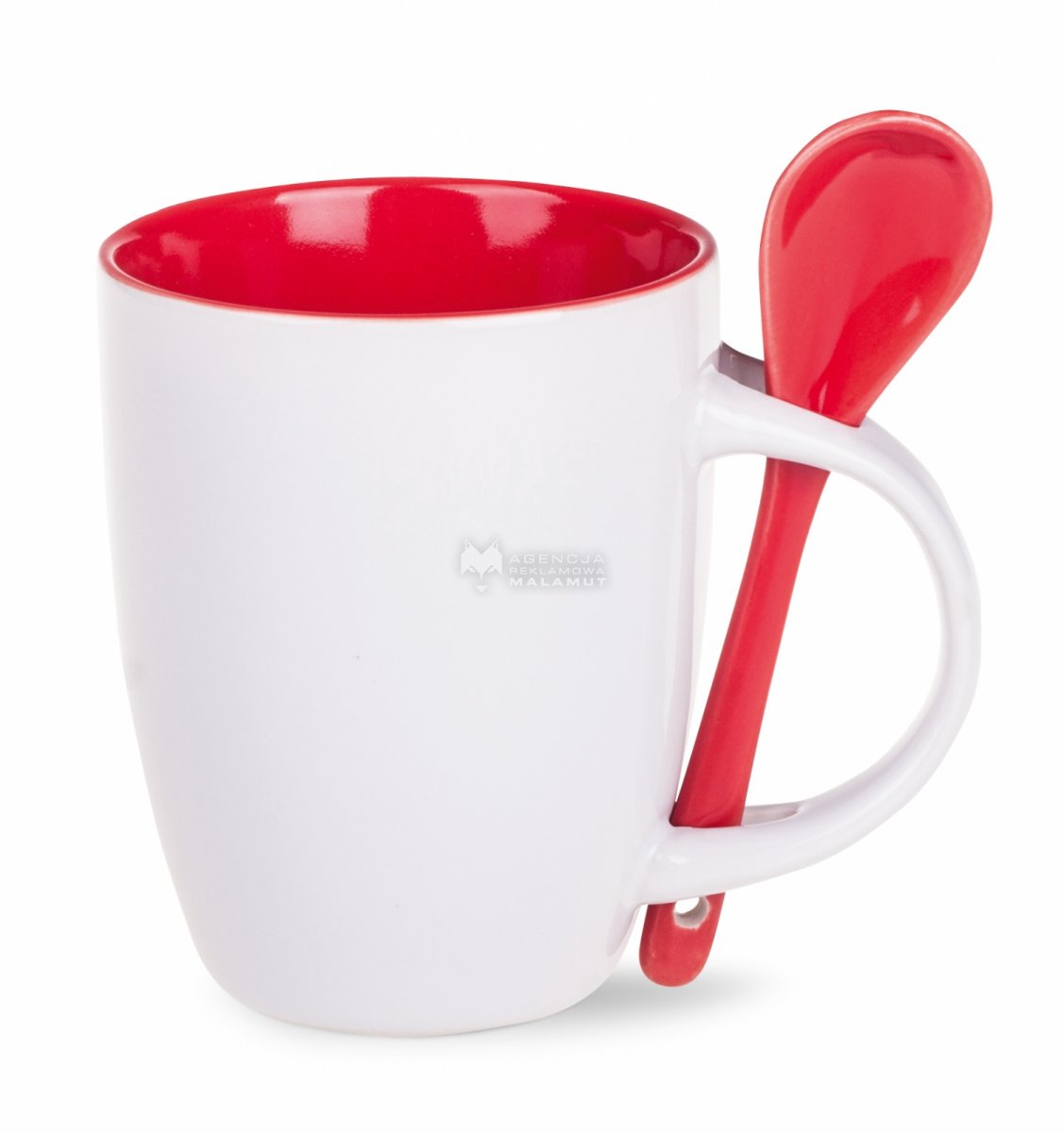 Kubek reklamowy z kolorowym wnętrzem i białym szkliwem na zewnątrz. W zestawie ceramiczna łyżeczka. Unikatowy kształt uchwytu ułatwia przechowywanie łyżeczki. Produkt jest końcówką serii, mogą na nim występować nakłucia, kropki oraz różnice w odcieniu szkliwa.