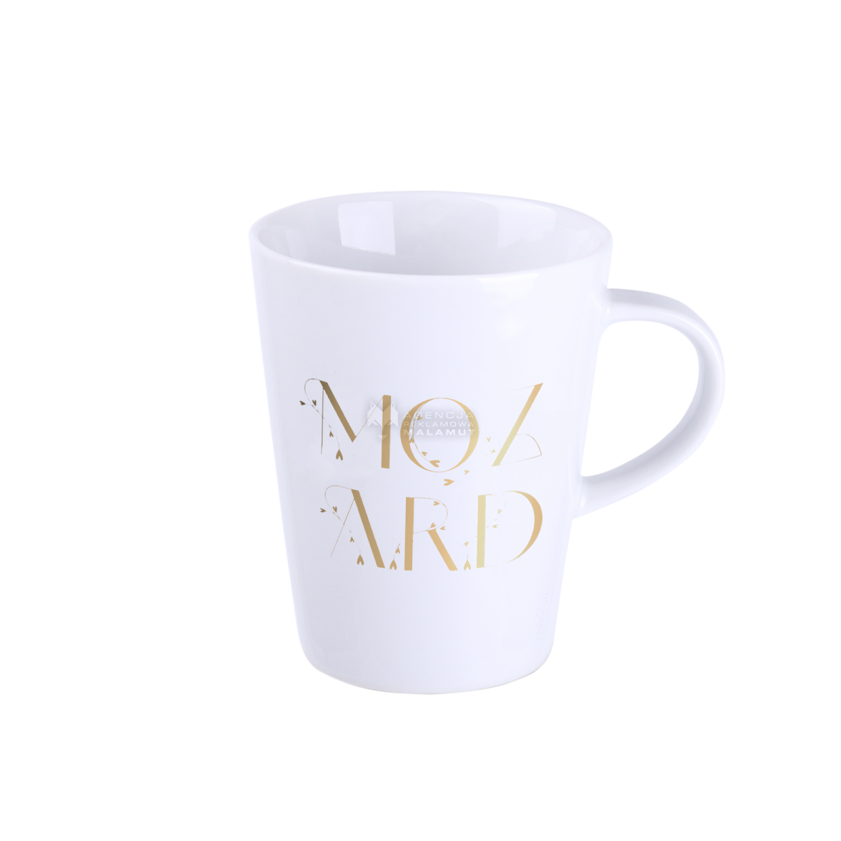 Pojemny kubek reklamowy o rozszerzających się ku górze stożkowych ściankach i klasycznym uchwycie. Popularny model w wersji ceramicznej. Produkt jest końcówką serii, mogą na nim występować nakłucia, kropki oraz różnice w odcieniu szkliwa.