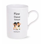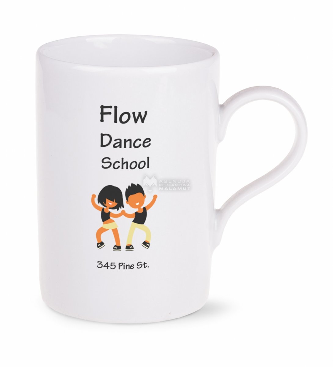Porcelanowy kubek reklamowy o prostym, cylindrycznym korpusie oraz uchwycie w kształcie połówki serca.