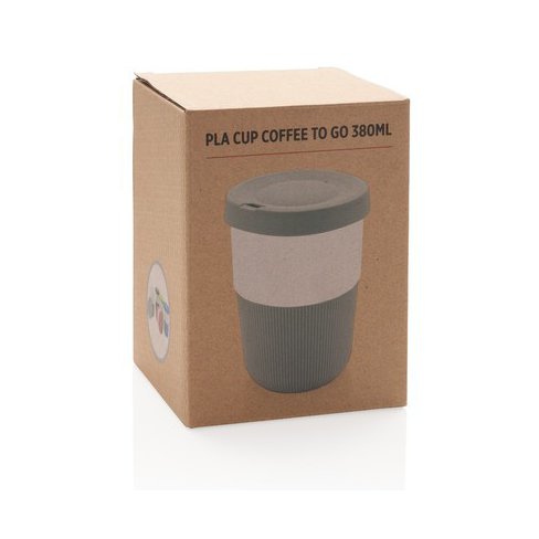 Kubek podróżny 380 ml, wykonany z PLA, silikonowe wieczko i uchwyt, nie zawiera melaminy, ślad węglowy produktu: 0,89 kg CO2