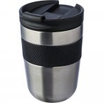 Kubek termiczny 300 ml posiada podwójne ścianki ze stali nierdzewnej z próżnią między ściankami, co spowalnia oddawanie temperatury na zewnątrz, zachowując funkcje termosu, silikonowy uchwyt zwiększający wygodę użytkowania, zapakowana w brązowy kartonik, produkt wykonany ze stali nierdzewnej, PP, silikonu