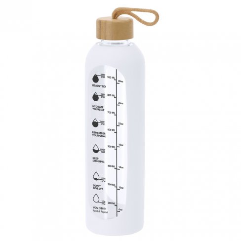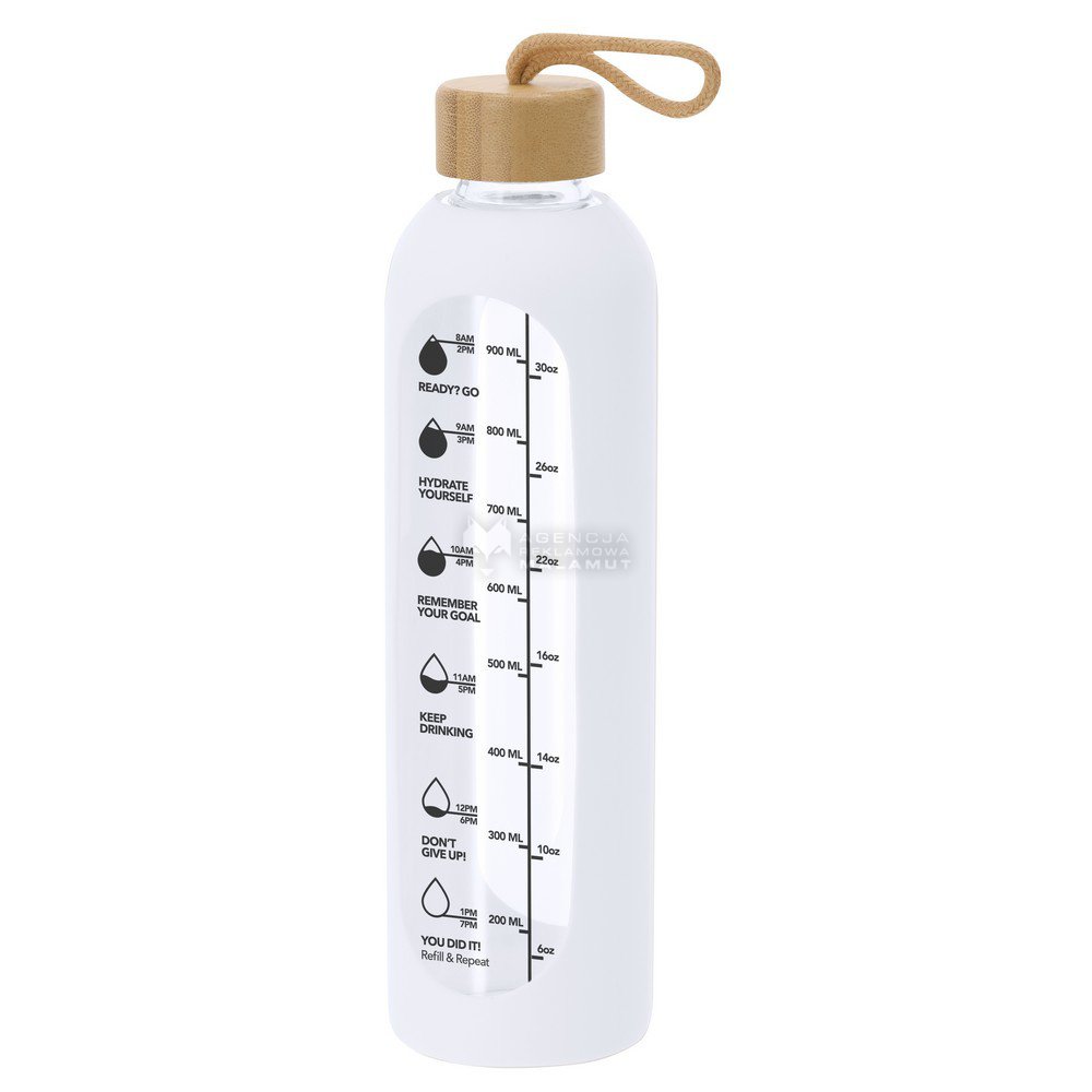 Butelka 1000 ml z bambusową zakrętką i uchwytem ułatwiającym noszenie, posiada silikonowy pokrowiec, produkt wykonany ze szkła