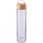 Szklana butelka 500 ml, metalowy uchwyt zwiększający wygodę użytkowania, bambusowa nakrętka, produkt zapakowany w brązowy kartonik